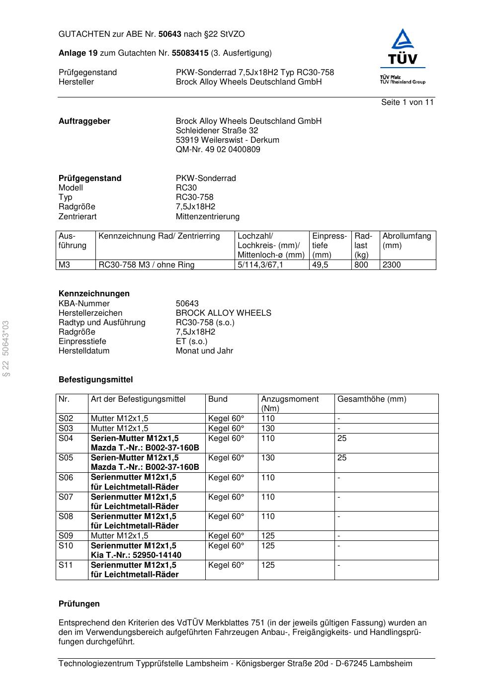 Dieses Gutachten (abe) bezieht sich auf die Alufelge Brock RC30-758 in der Ausführung 7.5Jx18 ET 0, Mittenloch 0 mm (KBA 50643). Im PDF findest du typischerweise zulässige Reifengrößen, Auflagen/Anbauhinweise und – je nach Dokument – Hinweise zur Eintragung.