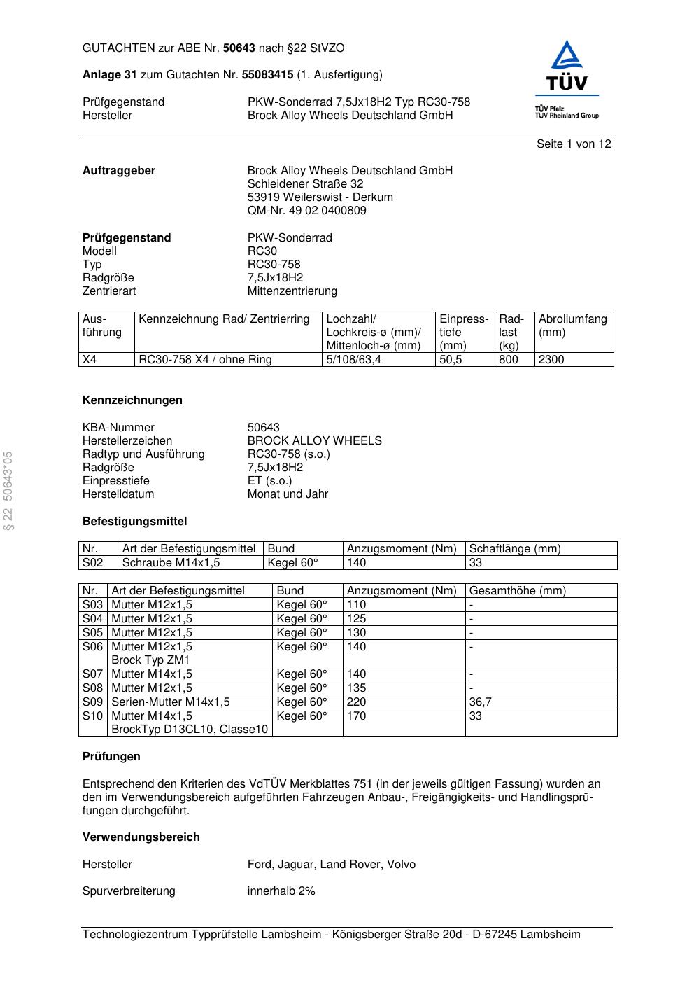 Dieses Gutachten (abe) bezieht sich auf die Alufelge Brock RC30-758 in der Ausführung 7.5Jx18 ET 0, Mittenloch 0 mm (KBA 50643). Im PDF findest du typischerweise zulässige Reifengrößen, Auflagen/Anbauhinweise und – je nach Dokument – Hinweise zur Eintragung.