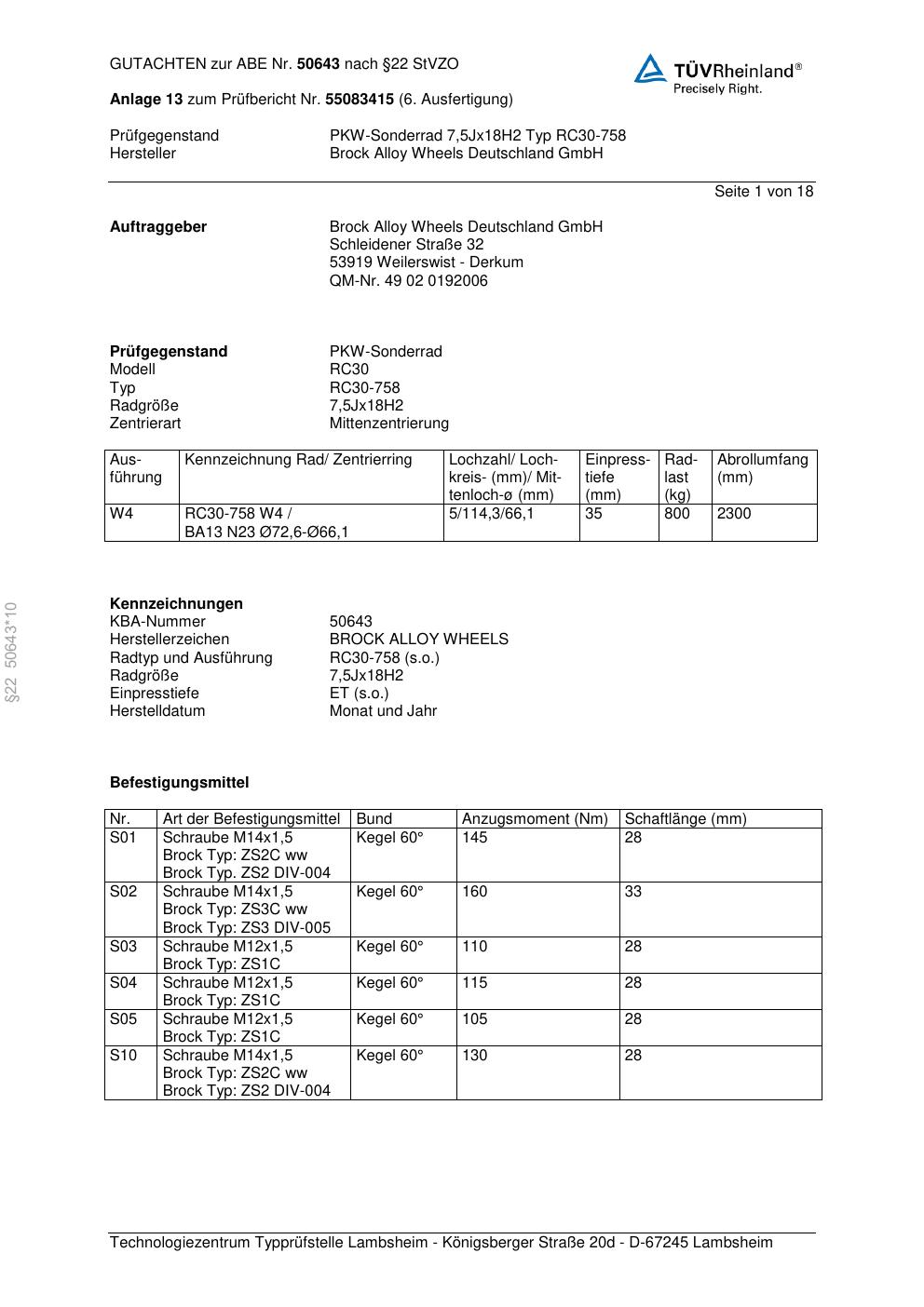 Dieses Gutachten (abe) bezieht sich auf die Alufelge Brock RC30-758 in der Ausführung 7.5Jx18 ET 0, Mittenloch 0 mm (KBA 50643). Im PDF findest du typischerweise zulässige Reifengrößen, Auflagen/Anbauhinweise und – je nach Dokument – Hinweise zur Eintragung.