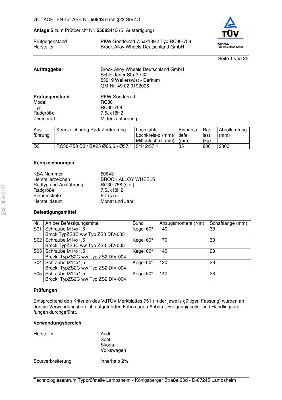 Dieses Gutachten (abe) bezieht sich auf die Alufelge Brock RC30-758 in der Ausführung 7.5Jx18 ET 0, Mittenloch 0 mm (KBA 50643). Im PDF findest du typischerweise zulässige Reifengrößen, Auflagen/Anbauhinweise und – je nach Dokument – Hinweise zur Eintragung.