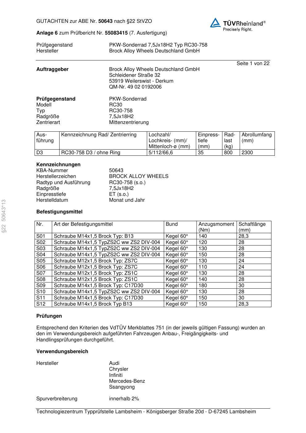 Dieses Gutachten (abe) bezieht sich auf die Alufelge Brock RC30-758 in der Ausführung 7.5Jx18 ET 0, Mittenloch 0 mm (KBA 50643). Im PDF findest du typischerweise zulässige Reifengrößen, Auflagen/Anbauhinweise und – je nach Dokument – Hinweise zur Eintragung.