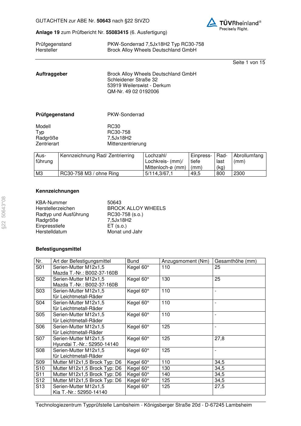 Dieses Gutachten (abe) bezieht sich auf die Alufelge Brock RC30-758 in der Ausführung 7.5Jx18 ET 0, Mittenloch 0 mm (KBA 50643). Im PDF findest du typischerweise zulässige Reifengrößen, Auflagen/Anbauhinweise und – je nach Dokument – Hinweise zur Eintragung.