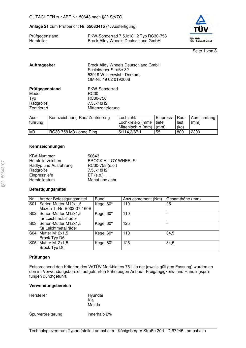 Dieses Gutachten (abe) bezieht sich auf die Alufelge Brock RC30-758 in der Ausführung 7.5Jx18 ET 0, Mittenloch 0 mm (KBA 50643). Im PDF findest du typischerweise zulässige Reifengrößen, Auflagen/Anbauhinweise und – je nach Dokument – Hinweise zur Eintragung.