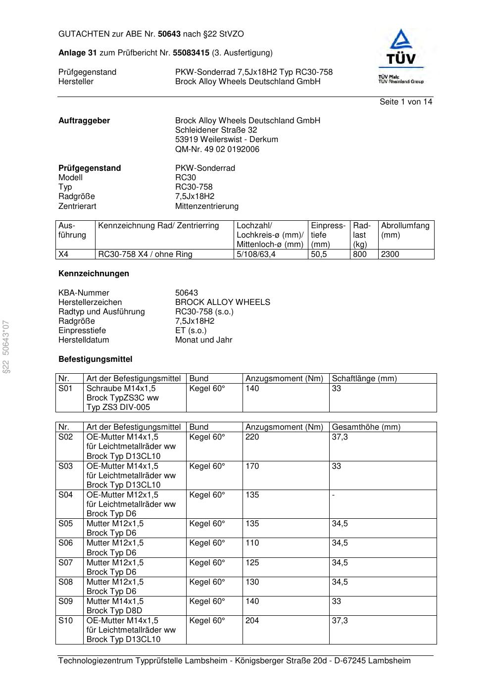 Dieses Gutachten (abe) bezieht sich auf die Alufelge Brock RC30-758 in der Ausführung 7.5Jx18 ET 0, Mittenloch 0 mm (KBA 50643). Im PDF findest du typischerweise zulässige Reifengrößen, Auflagen/Anbauhinweise und – je nach Dokument – Hinweise zur Eintragung.