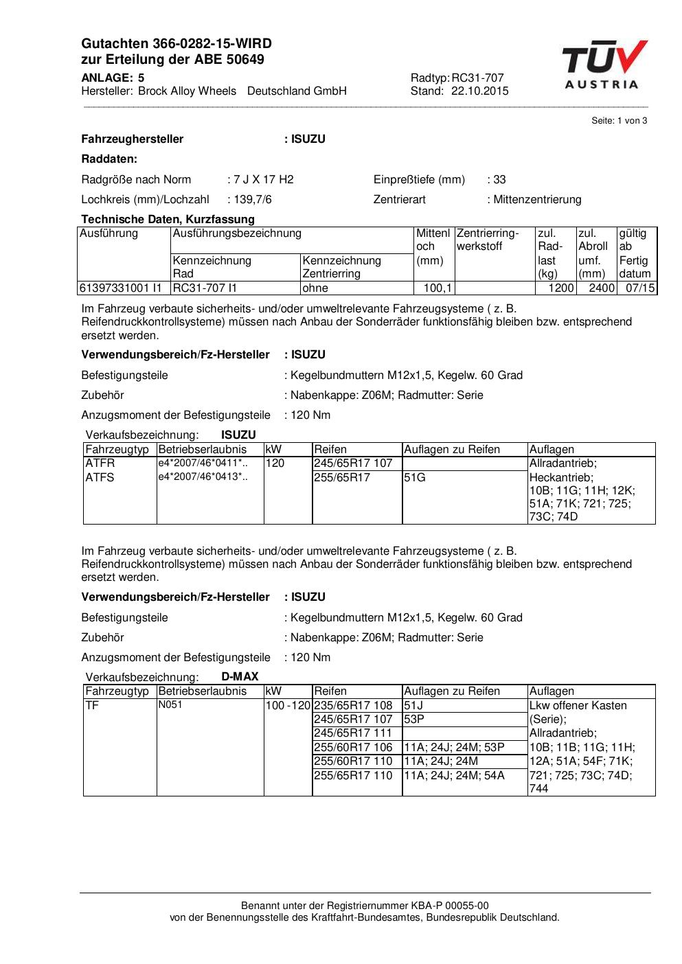 Dieses Gutachten (abe) bezieht sich auf die Alufelge Brock RC31 -707 in der Ausführung 7Jx17 ET 0, Mittenloch 0 mm (KBA 50649). Im PDF findest du typischerweise zulässige Reifengrößen, Auflagen/Anbauhinweise und – je nach Dokument – Hinweise zur Eintragung.