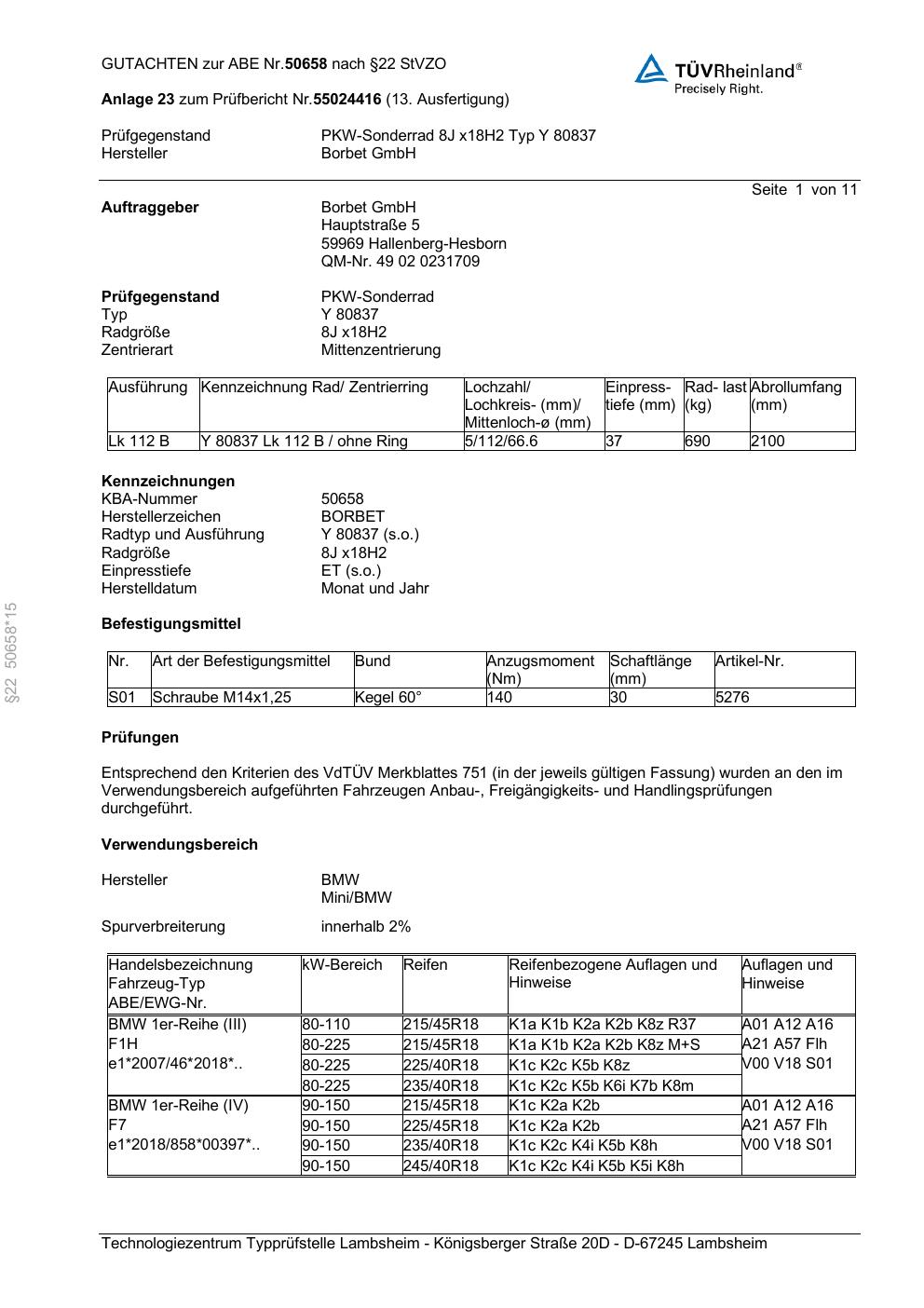 Dieses Gutachten (abe) bezieht sich auf die Alufelge Borbet Y 80837 in der Ausführung 8Jx18 ET 0, Mittenloch 0 mm (KBA 50658). Im PDF findest du typischerweise zulässige Reifengrößen, Auflagen/Anbauhinweise und – je nach Dokument – Hinweise zur Eintragung.