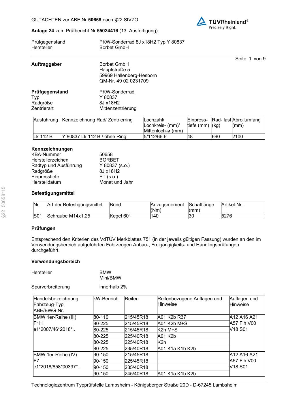 Dieses Gutachten (abe) bezieht sich auf die Alufelge Borbet Y 80837 in der Ausführung 8Jx18 ET 0, Mittenloch 0 mm (KBA 50658). Im PDF findest du typischerweise zulässige Reifengrößen, Auflagen/Anbauhinweise und – je nach Dokument – Hinweise zur Eintragung.