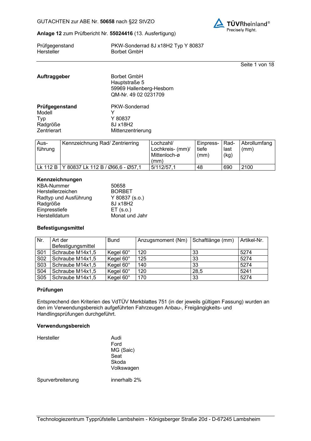 Dieses Gutachten (abe) bezieht sich auf die Alufelge Borbet Y 80837 in der Ausführung 8Jx18 ET 0, Mittenloch 0 mm (KBA 50658). Im PDF findest du typischerweise zulässige Reifengrößen, Auflagen/Anbauhinweise und – je nach Dokument – Hinweise zur Eintragung.