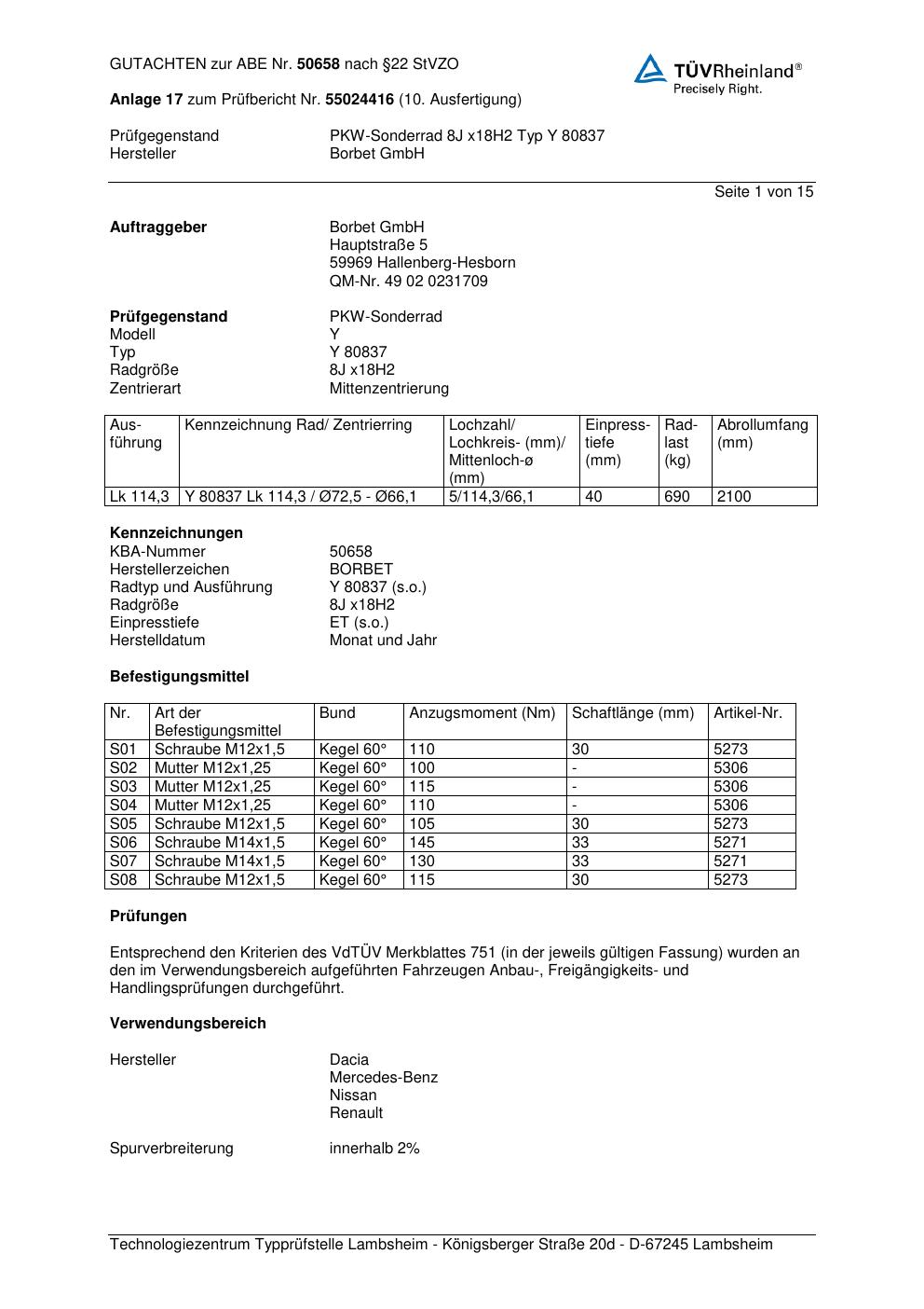 Dieses Gutachten (abe) bezieht sich auf die Alufelge Borbet Y 80837 in der Ausführung 8Jx18 ET 0, Mittenloch 0 mm (KBA 50658). Im PDF findest du typischerweise zulässige Reifengrößen, Auflagen/Anbauhinweise und – je nach Dokument – Hinweise zur Eintragung.