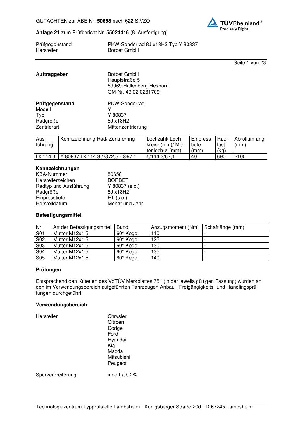 Felgengutachten / abe für Alufelgen Borbet Y 80837 (8Jx18 ET 0, Mittenloch 0 mm) mit KBA 50658 (Zertifikatsnummer 50658). Hier kostenlos als PDF herunterladen. Der Download-Link ist 24 Stunden gültig und kann bis zu zwei Mal verwendet werden.