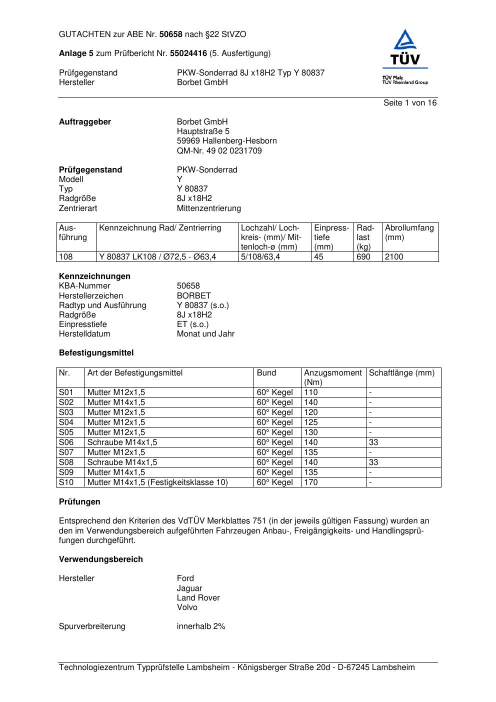 Felgengutachten / abe für Alufelgen Borbet Y 80837 (8Jx18 ET 0, Mittenloch 0 mm) mit KBA 50658 (Zertifikatsnummer 50658). Hier kostenlos als PDF herunterladen. Der Download-Link ist 24 Stunden gültig und kann bis zu zwei Mal verwendet werden.