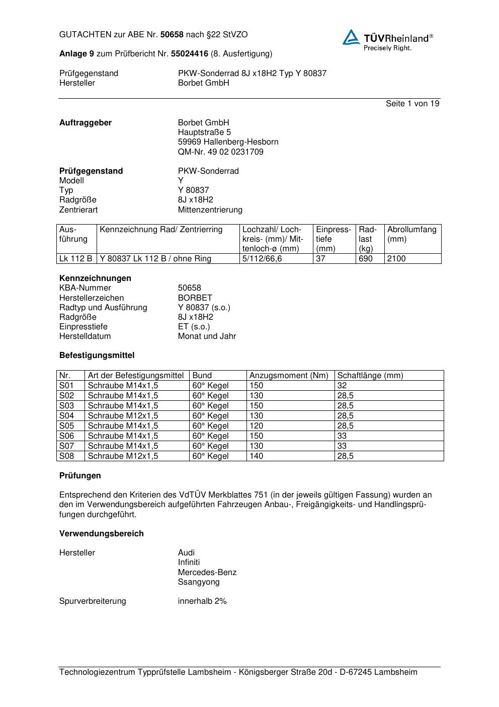 Dieses Gutachten (abe) bezieht sich auf die Alufelge Borbet Y 80837 in der Ausführung 8Jx18 ET 0, Mittenloch 0 mm (KBA 50658). Im PDF findest du typischerweise zulässige Reifengrößen, Auflagen/Anbauhinweise und – je nach Dokument – Hinweise zur Eintragung.