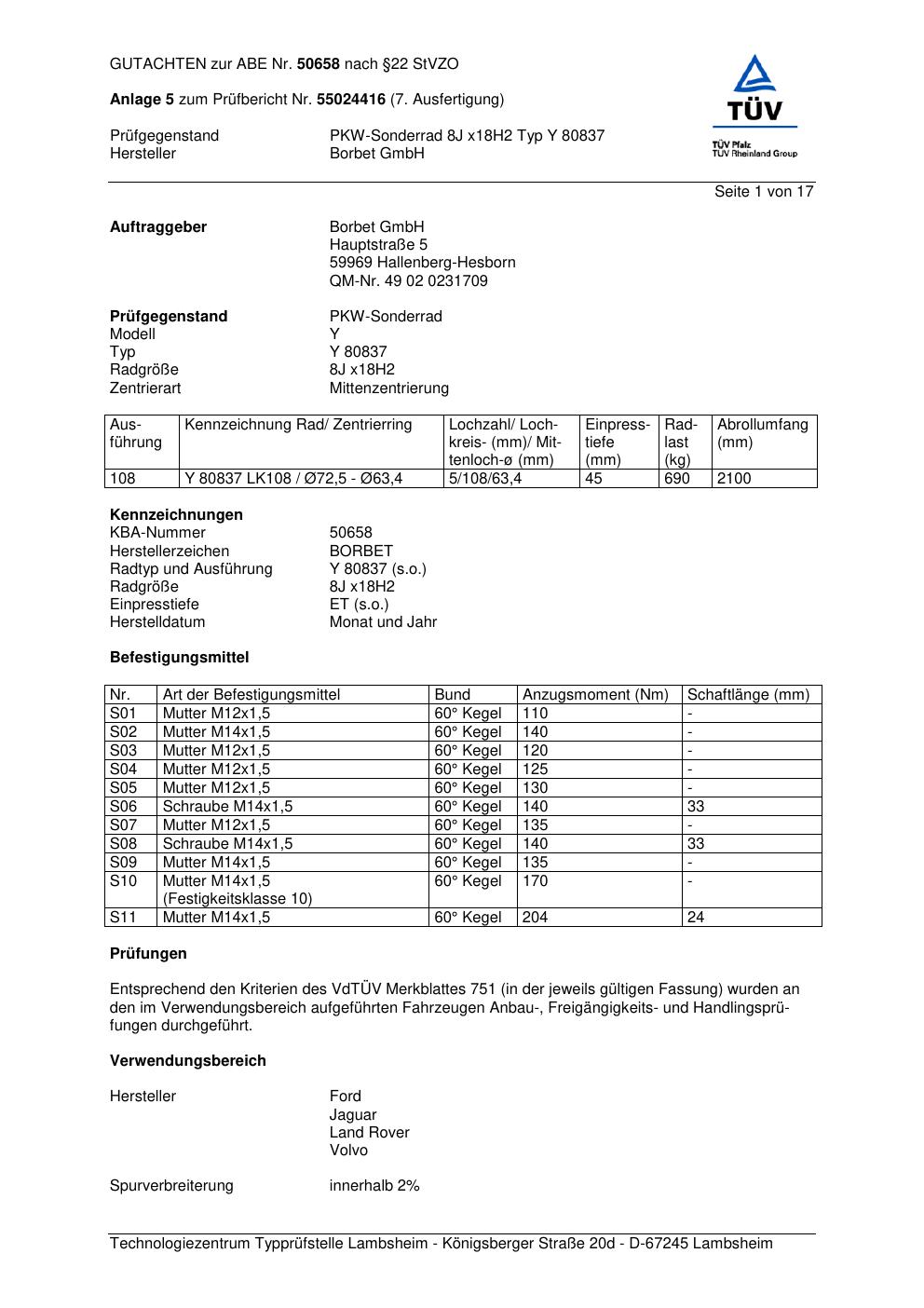 Dieses Gutachten (abe) bezieht sich auf die Alufelge Borbet Y 80837 in der Ausführung 8Jx18 ET 0, Mittenloch 0 mm (KBA 50658). Im PDF findest du typischerweise zulässige Reifengrößen, Auflagen/Anbauhinweise und – je nach Dokument – Hinweise zur Eintragung.