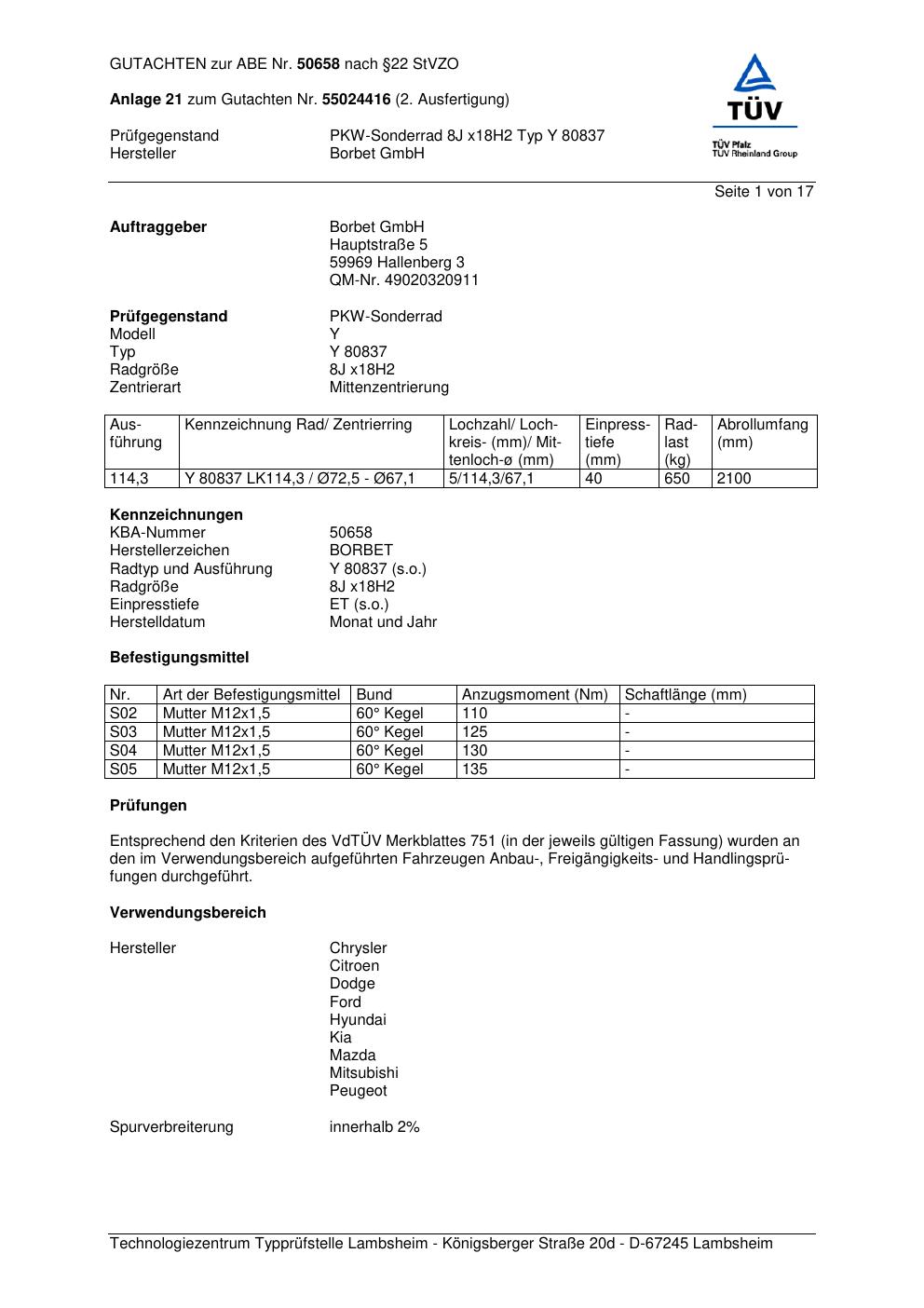 Dieses Gutachten (abe) bezieht sich auf die Alufelge Borbet Y 80837 in der Ausführung 8Jx18 ET 0, Mittenloch 0 mm (KBA 50658). Im PDF findest du typischerweise zulässige Reifengrößen, Auflagen/Anbauhinweise und – je nach Dokument – Hinweise zur Eintragung.