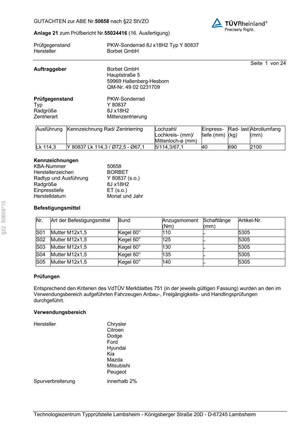 Dieses Gutachten (abe) bezieht sich auf die Alufelge Borbet Y 80837 in der Ausführung 8Jx18 ET 0, Mittenloch 0 mm (KBA 50658). Im PDF findest du typischerweise zulässige Reifengrößen, Auflagen/Anbauhinweise und – je nach Dokument – Hinweise zur Eintragung.