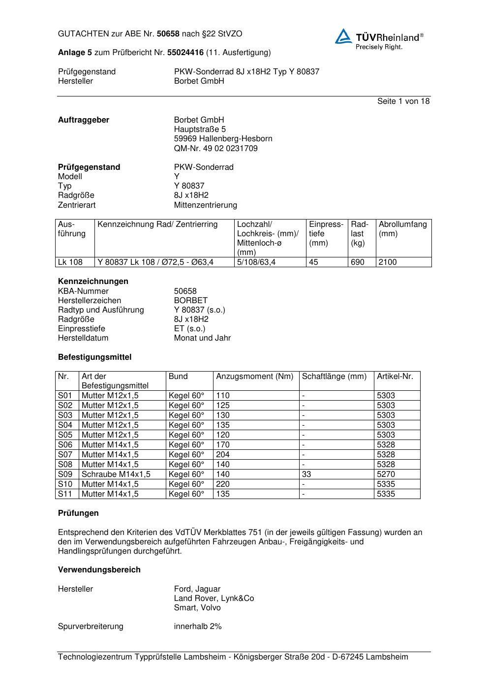 Dieses Gutachten (abe) bezieht sich auf die Alufelge Borbet Y 80837 in der Ausführung 8Jx18 ET 0, Mittenloch 0 mm (KBA 50658). Im PDF findest du typischerweise zulässige Reifengrößen, Auflagen/Anbauhinweise und – je nach Dokument – Hinweise zur Eintragung.