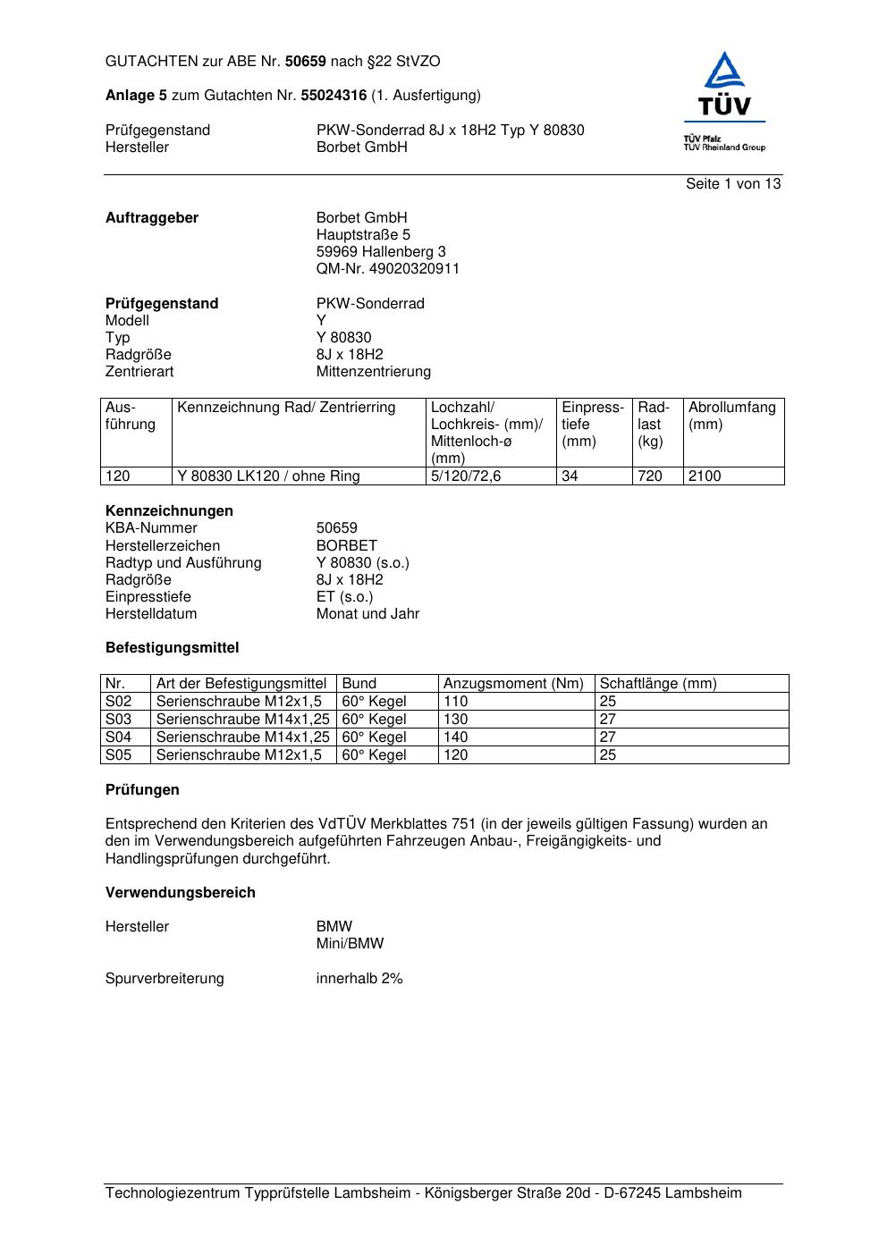 Dieses Gutachten (abe) bezieht sich auf die Alufelge Borbet Y 80830 in der Ausführung 8Jx18 ET 0, Mittenloch 0 mm (KBA 50659). Im PDF findest du typischerweise zulässige Reifengrößen, Auflagen/Anbauhinweise und – je nach Dokument – Hinweise zur Eintragung.