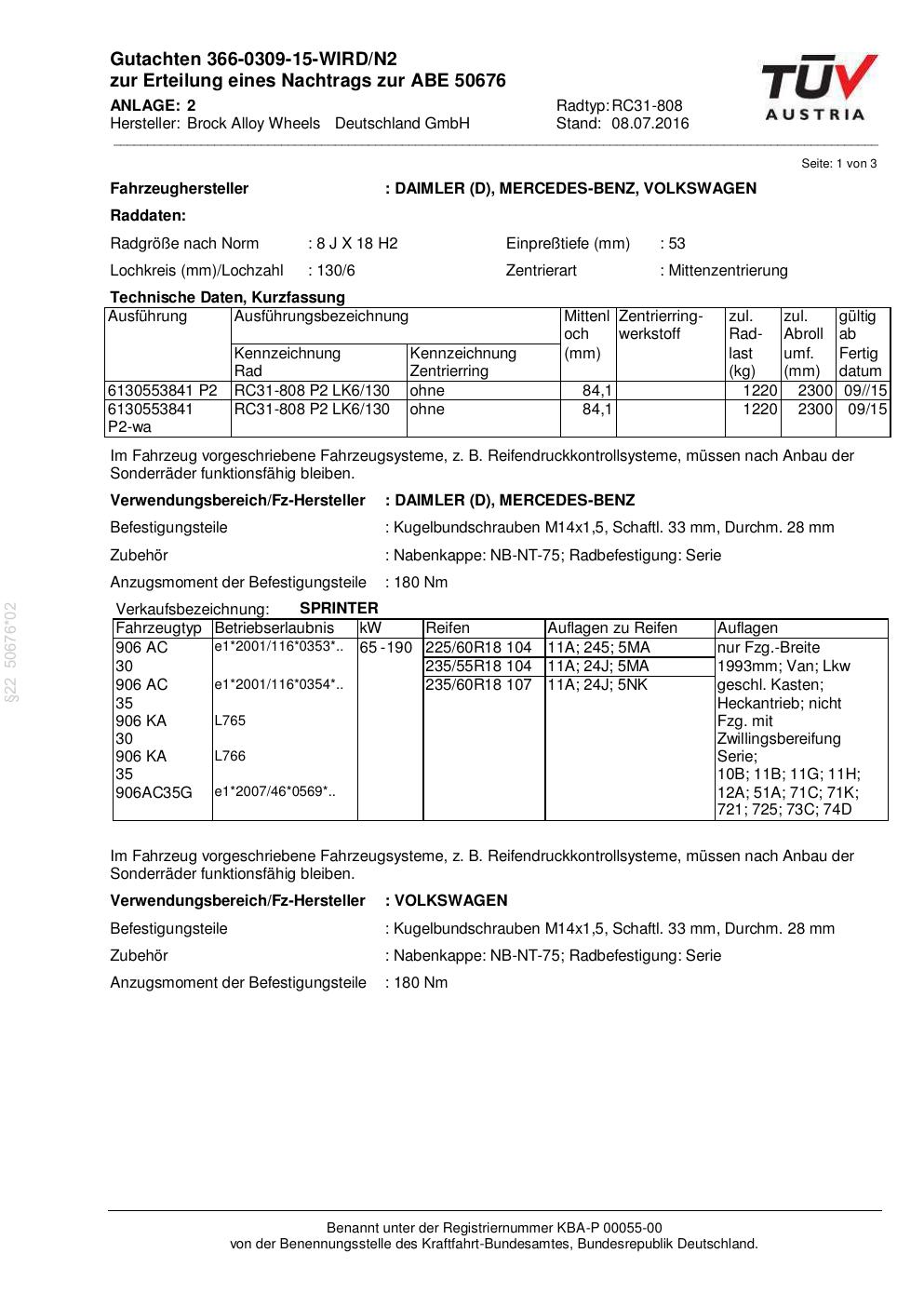 Dieses Gutachten (abe) bezieht sich auf die Alufelge Brock RC31-808 in der Ausführung 8Jx18 ET 0, Mittenloch 0 mm (KBA 50676). Im PDF findest du typischerweise zulässige Reifengrößen, Auflagen/Anbauhinweise und – je nach Dokument – Hinweise zur Eintragung.