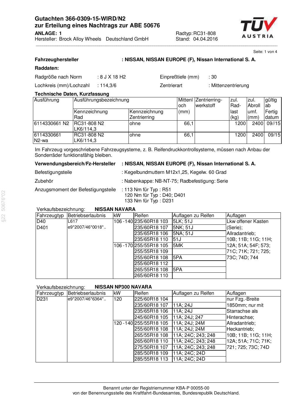 Dieses Gutachten (abe) bezieht sich auf die Alufelge Brock RC31-808 in der Ausführung 8Jx18 ET 0, Mittenloch 0 mm (KBA 50676). Im PDF findest du typischerweise zulässige Reifengrößen, Auflagen/Anbauhinweise und – je nach Dokument – Hinweise zur Eintragung.