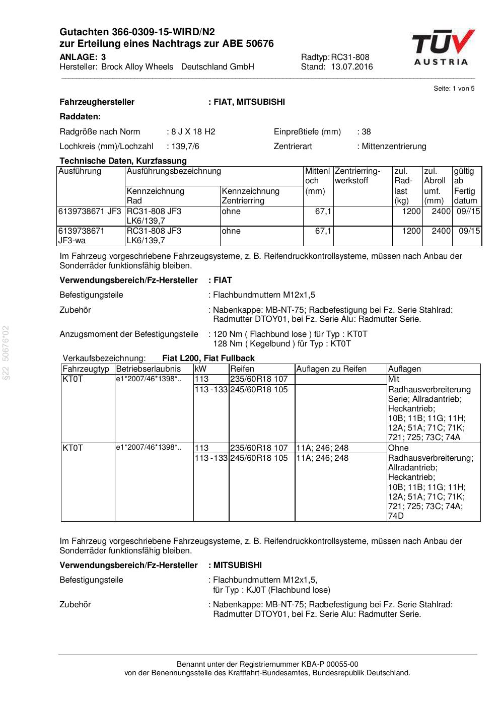Dieses Gutachten (abe) bezieht sich auf die Alufelge Brock RC31-808 in der Ausführung 8Jx18 ET 0, Mittenloch 0 mm (KBA 50676). Im PDF findest du typischerweise zulässige Reifengrößen, Auflagen/Anbauhinweise und – je nach Dokument – Hinweise zur Eintragung.
