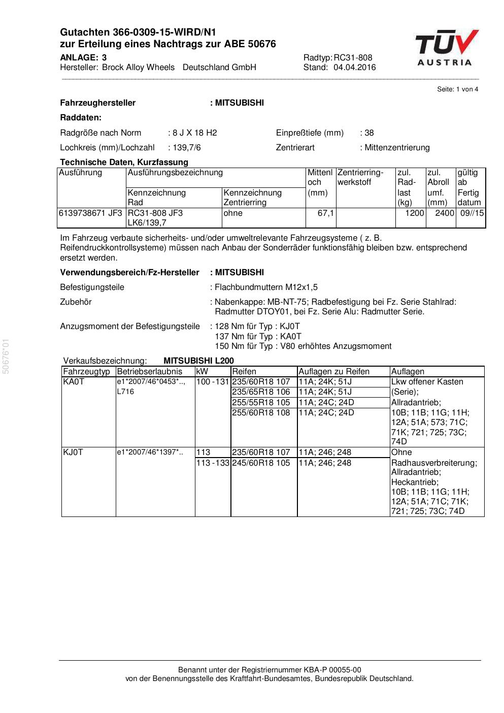 Dieses Gutachten (abe) bezieht sich auf die Alufelge Brock RC31-808 in der Ausführung 8Jx18 ET 0, Mittenloch 0 mm (KBA 50676). Im PDF findest du typischerweise zulässige Reifengrößen, Auflagen/Anbauhinweise und – je nach Dokument – Hinweise zur Eintragung.