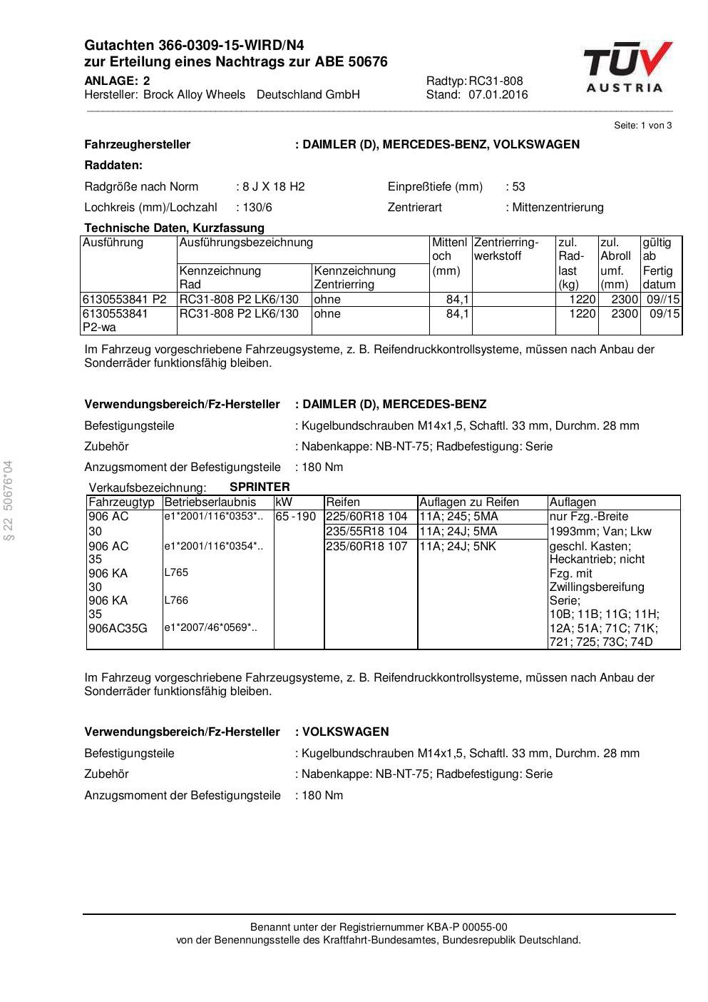 Dieses Gutachten (abe) bezieht sich auf die Alufelge Brock RC31-808 in der Ausführung 8Jx18 ET 0, Mittenloch 0 mm (KBA 50676). Im PDF findest du typischerweise zulässige Reifengrößen, Auflagen/Anbauhinweise und – je nach Dokument – Hinweise zur Eintragung.