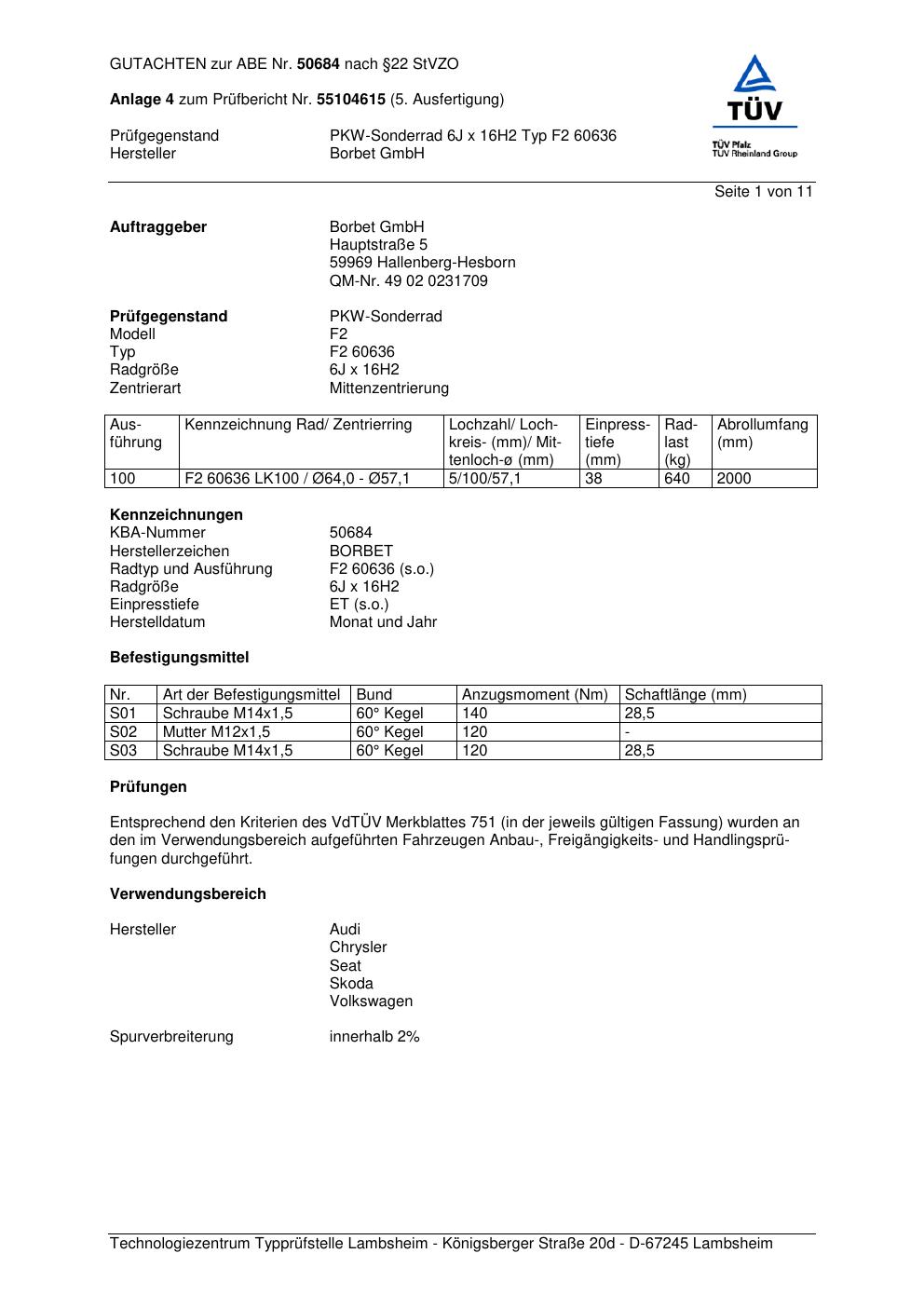 Dieses Gutachten (abe) bezieht sich auf die Alufelge Borbet F2 60636 in der Ausführung 6Jx16 ET 0, Mittenloch 0 mm (KBA 50684). Im PDF findest du typischerweise zulässige Reifengrößen, Auflagen/Anbauhinweise und – je nach Dokument – Hinweise zur Eintragung.