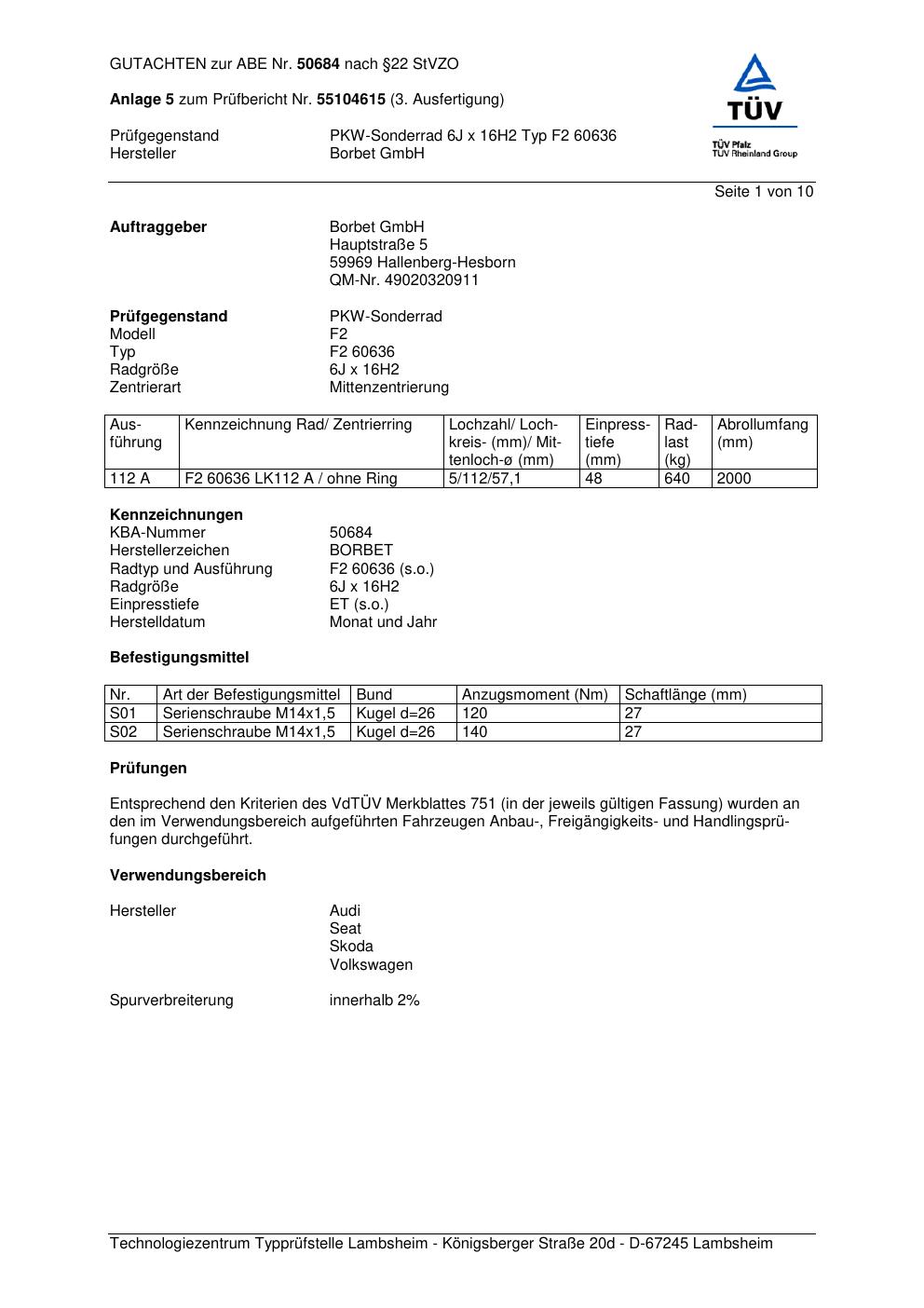 Dieses Gutachten (abe) bezieht sich auf die Alufelge Borbet F2 60636 in der Ausführung 6Jx16 ET 0, Mittenloch 0 mm (KBA 50684). Im PDF findest du typischerweise zulässige Reifengrößen, Auflagen/Anbauhinweise und – je nach Dokument – Hinweise zur Eintragung.