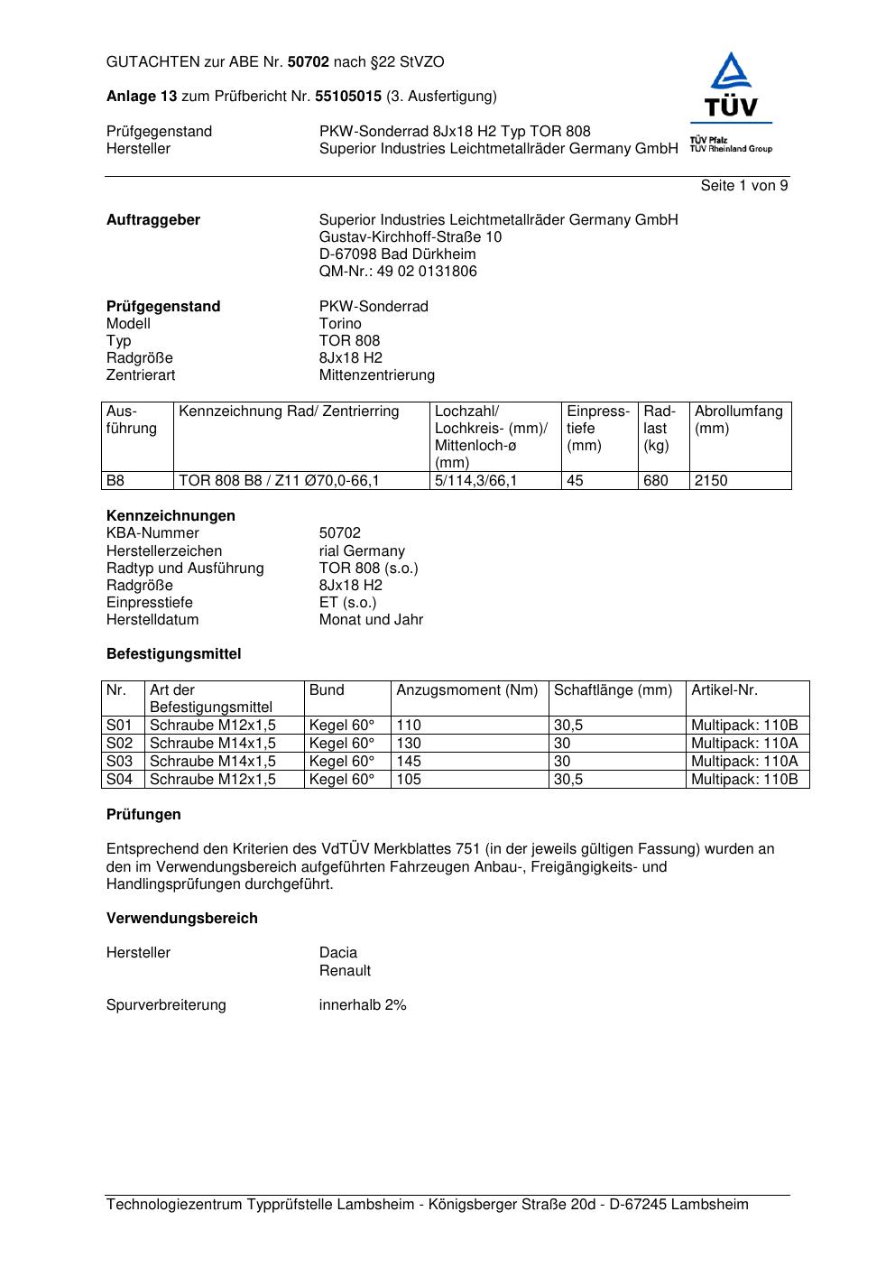 Dieses Gutachten (abe) bezieht sich auf die Alufelge brand-rial TOR 808 in der Ausführung 8Jx18 ET 0, Mittenloch 0 mm (KBA 50702). Im PDF findest du typischerweise zulässige Reifengrößen, Auflagen/Anbauhinweise und – je nach Dokument – Hinweise zur Eintragung.