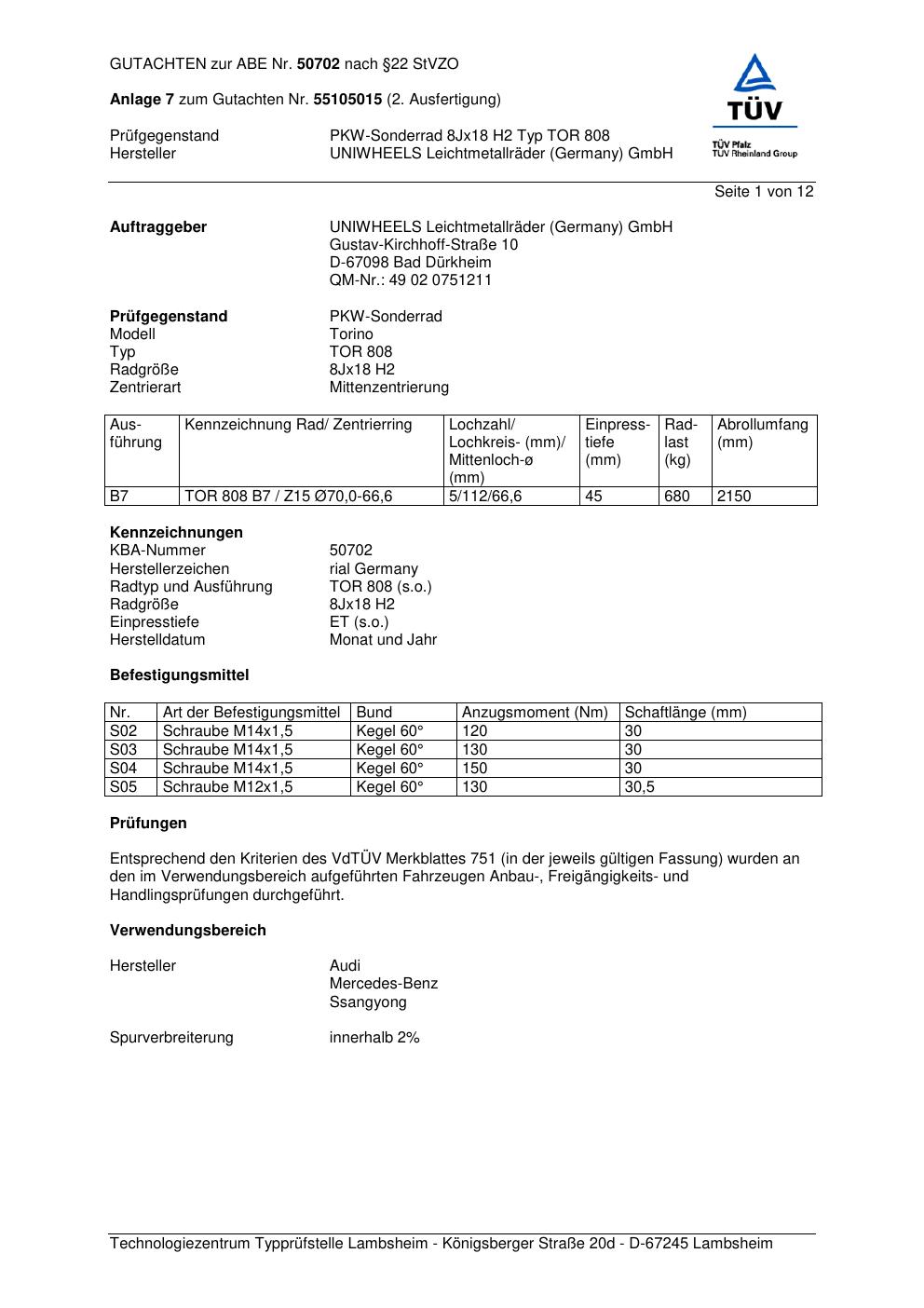 Dieses Gutachten (abe) bezieht sich auf die Alufelge brand-rial TOR 808 in der Ausführung 8Jx18 ET 0, Mittenloch 0 mm (KBA 50702). Im PDF findest du typischerweise zulässige Reifengrößen, Auflagen/Anbauhinweise und – je nach Dokument – Hinweise zur Eintragung.