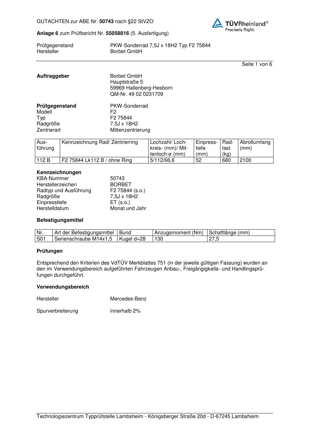 Dieses Gutachten (abe) bezieht sich auf die Alufelge Borbet F2 758 44 in der Ausführung 7.5Jx18 ET 0, Mittenloch 0 mm (KBA 50743). Im PDF findest du typischerweise zulässige Reifengrößen, Auflagen/Anbauhinweise und – je nach Dokument – Hinweise zur Eintragung.