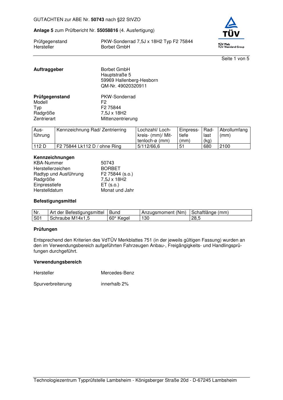 Dieses Gutachten (abe) bezieht sich auf die Alufelge Borbet F2 758 44 in der Ausführung 7.5Jx18 ET 0, Mittenloch 0 mm (KBA 50743). Im PDF findest du typischerweise zulässige Reifengrößen, Auflagen/Anbauhinweise und – je nach Dokument – Hinweise zur Eintragung.