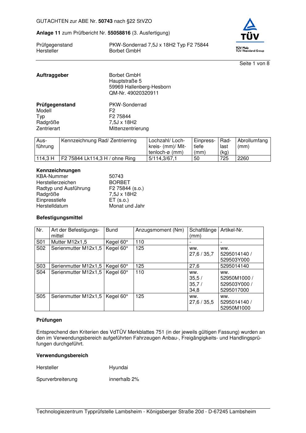 Dieses Gutachten (abe) bezieht sich auf die Alufelge Borbet F2 758 44 in der Ausführung 7.5Jx18 ET 0, Mittenloch 0 mm (KBA 50743). Im PDF findest du typischerweise zulässige Reifengrößen, Auflagen/Anbauhinweise und – je nach Dokument – Hinweise zur Eintragung.
