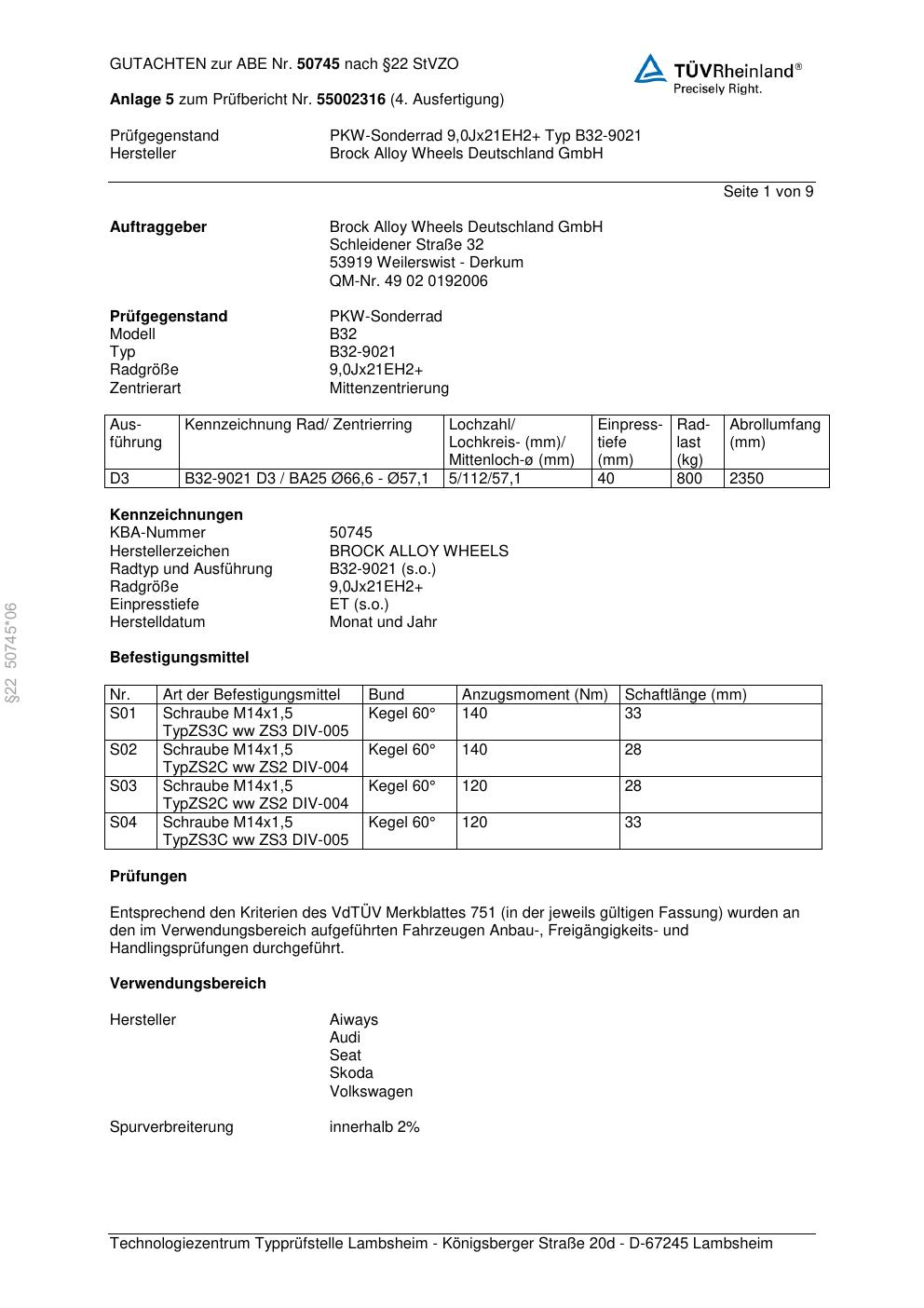 Dieses Gutachten (abe) bezieht sich auf die Alufelge Brock B32-90 21 in der Ausführung ET 0, Mittenloch 0 mm (KBA 50745). Im PDF findest du typischerweise zulässige Reifengrößen, Auflagen/Anbauhinweise und – je nach Dokument – Hinweise zur Eintragung.