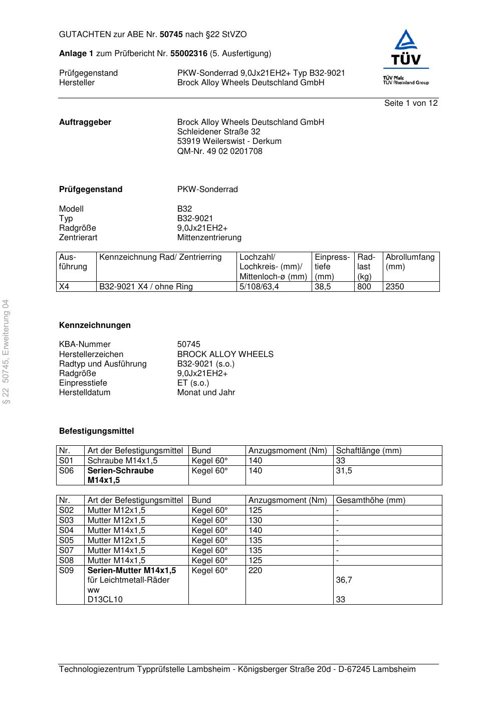 Dieses Gutachten (abe) bezieht sich auf die Alufelge Brock B32-90 21 in der Ausführung ET 0, Mittenloch 0 mm (KBA 50745). Im PDF findest du typischerweise zulässige Reifengrößen, Auflagen/Anbauhinweise und – je nach Dokument – Hinweise zur Eintragung.