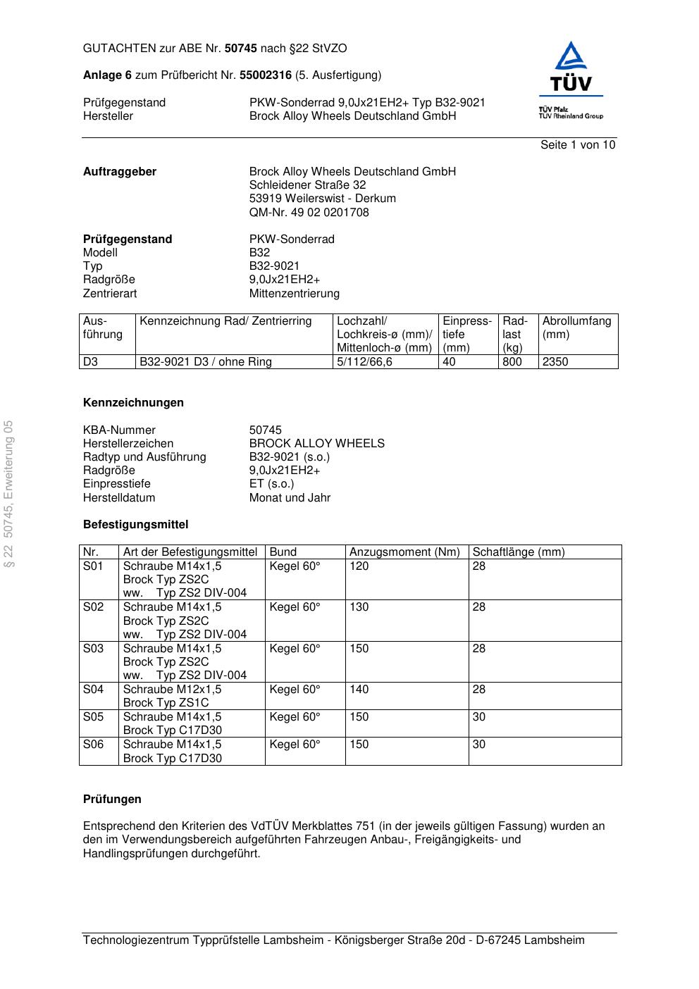Dieses Gutachten (abe) bezieht sich auf die Alufelge Brock B32-90 21 in der Ausführung ET 0, Mittenloch 0 mm (KBA 50745). Im PDF findest du typischerweise zulässige Reifengrößen, Auflagen/Anbauhinweise und – je nach Dokument – Hinweise zur Eintragung.