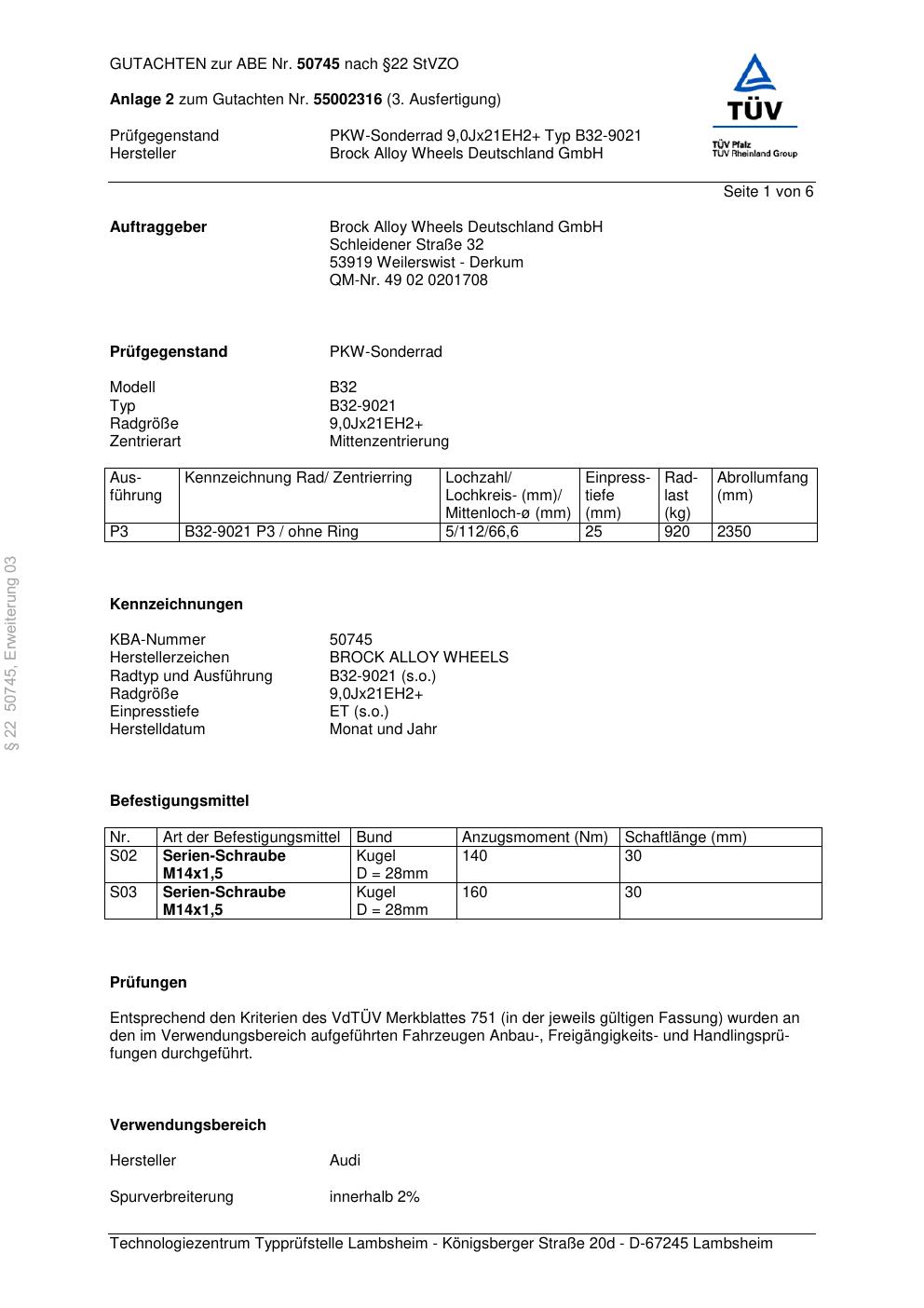 Dieses Gutachten (abe) bezieht sich auf die Alufelge Brock B32-90 21 in der Ausführung ET 0, Mittenloch 0 mm (KBA 50745). Im PDF findest du typischerweise zulässige Reifengrößen, Auflagen/Anbauhinweise und – je nach Dokument – Hinweise zur Eintragung.
