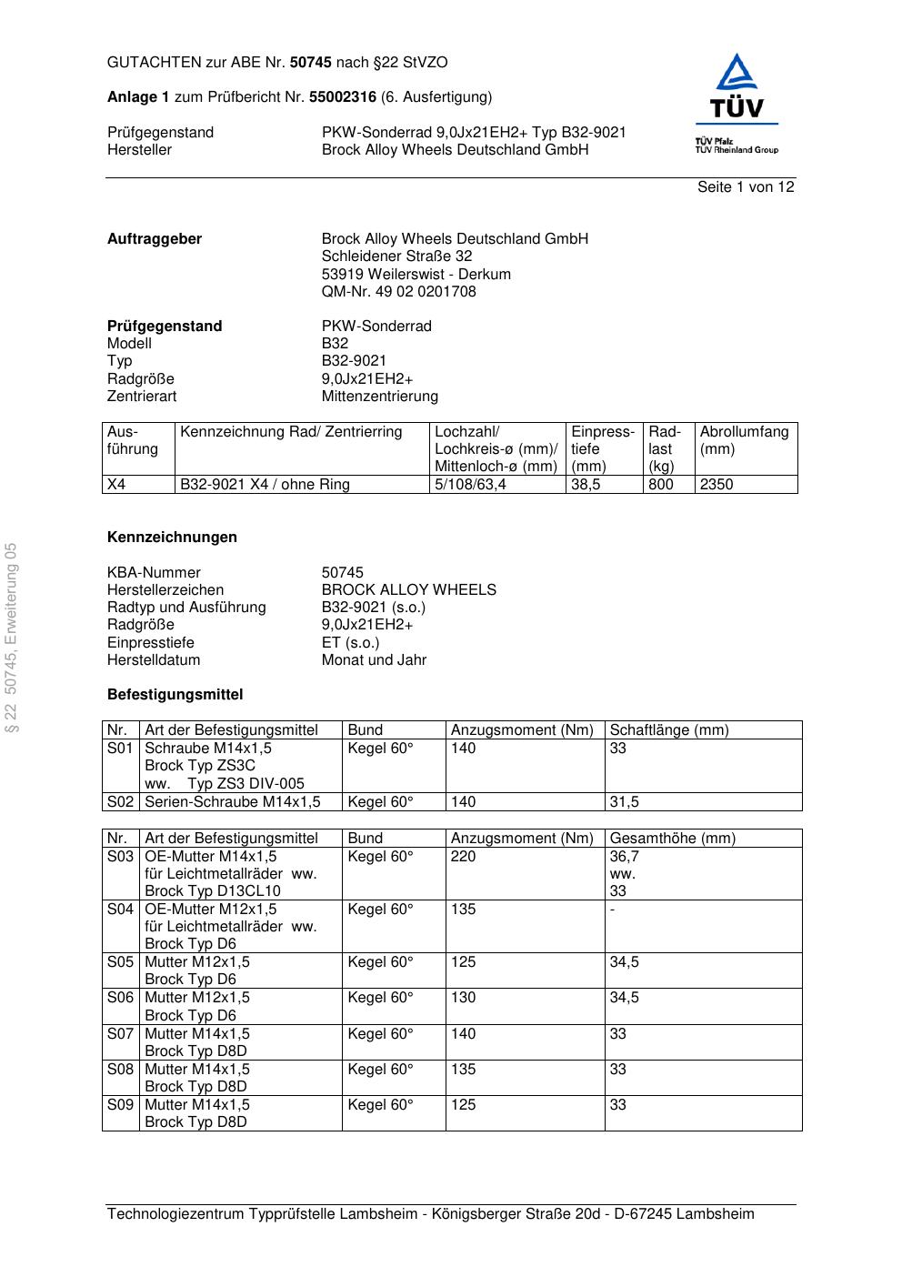 Dieses Gutachten (abe) bezieht sich auf die Alufelge Brock B32-90 21 in der Ausführung 8.5Jx21 ET 0, Mittenloch 0 mm (KBA 50745). Im PDF findest du typischerweise zulässige Reifengrößen, Auflagen/Anbauhinweise und – je nach Dokument – Hinweise zur Eintragung.