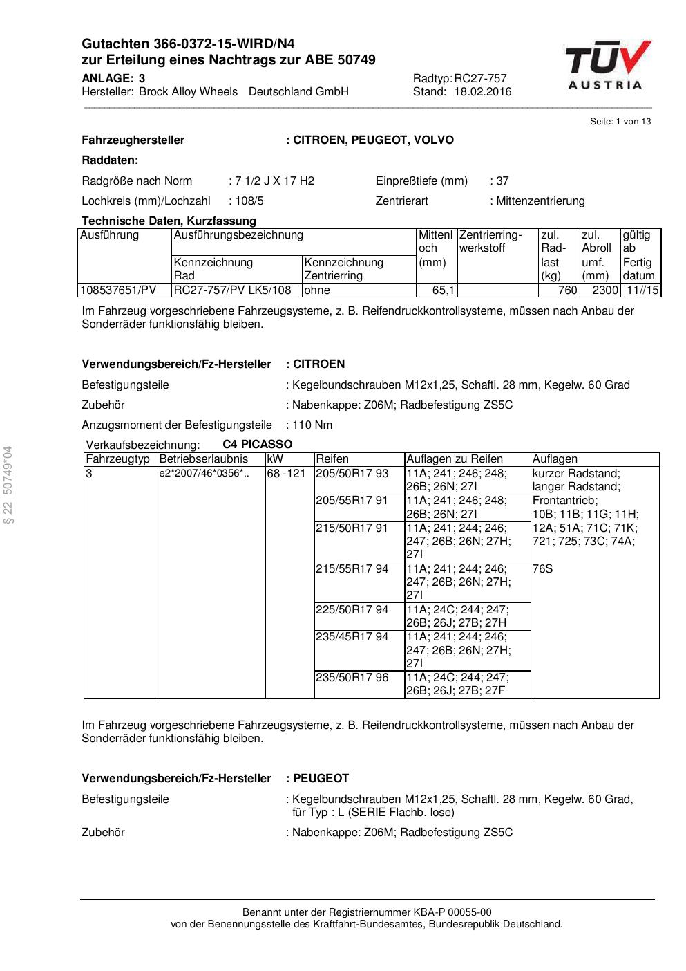 Dieses Gutachten (abe) bezieht sich auf die Alufelge Brock RC27-757 in der Ausführung 2Jx17 ET 0, Mittenloch 0 mm (KBA 50749). Im PDF findest du typischerweise zulässige Reifengrößen, Auflagen/Anbauhinweise und – je nach Dokument – Hinweise zur Eintragung.