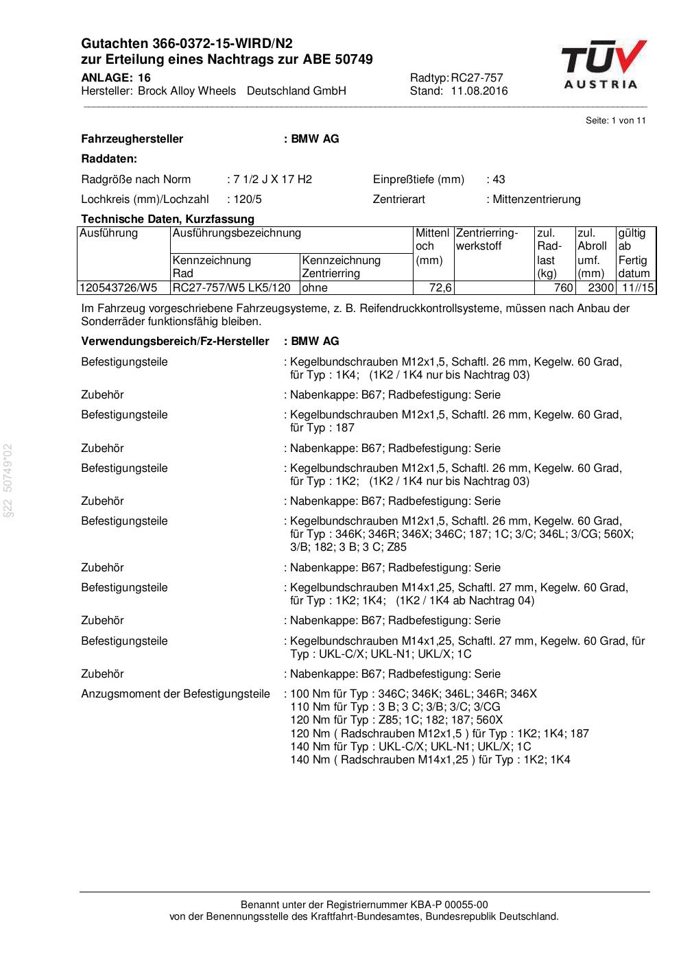Dieses Gutachten (abe) bezieht sich auf die Alufelge Brock RC27-757 in der Ausführung 2Jx17 ET 0, Mittenloch 0 mm (KBA 50749). Im PDF findest du typischerweise zulässige Reifengrößen, Auflagen/Anbauhinweise und – je nach Dokument – Hinweise zur Eintragung.