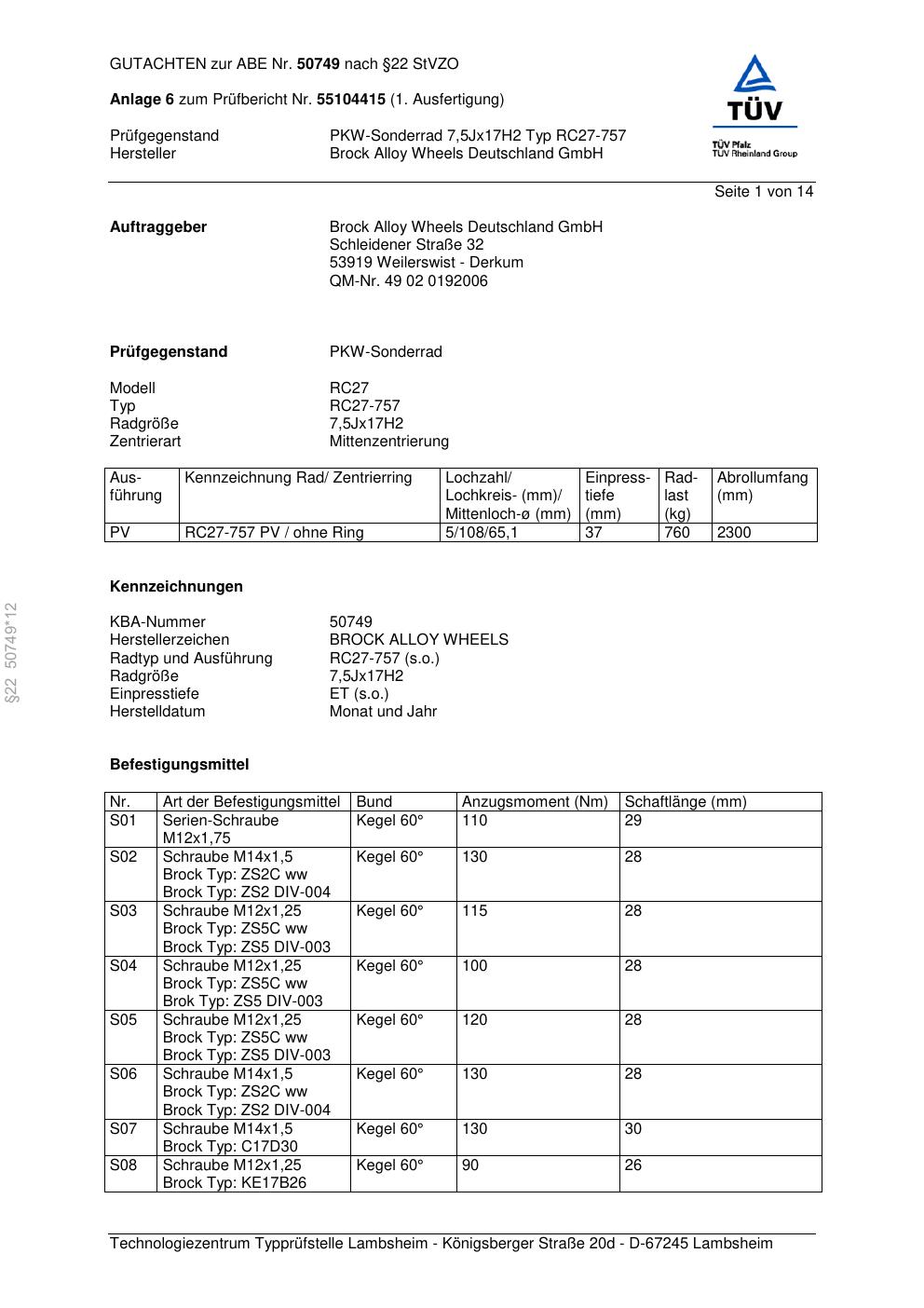 Dieses Gutachten (abe) bezieht sich auf die Alufelge Brock RC27-757 in der Ausführung 7.5Jx17 ET 0, Mittenloch 0 mm (KBA 50749). Im PDF findest du typischerweise zulässige Reifengrößen, Auflagen/Anbauhinweise und – je nach Dokument – Hinweise zur Eintragung.