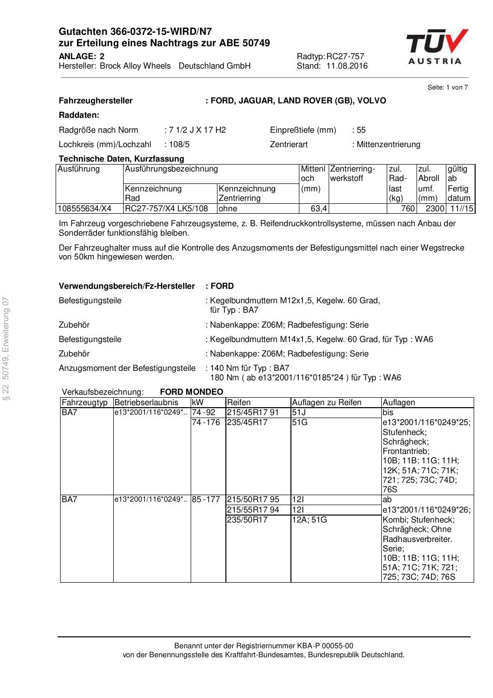 Dieses Gutachten (abe) bezieht sich auf die Alufelge Brock RC27-757 in der Ausführung 2Jx17 ET 0, Mittenloch 0 mm (KBA 50749). Im PDF findest du typischerweise zulässige Reifengrößen, Auflagen/Anbauhinweise und – je nach Dokument – Hinweise zur Eintragung.