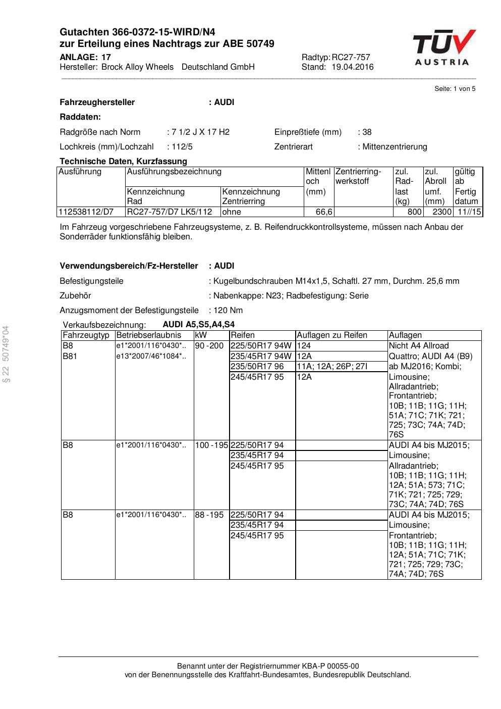 Felgengutachten / abe für Alufelgen Brock RC27-757 (2Jx17 ET 0, Mittenloch 0 mm) mit KBA 50749 (Zertifikatsnummer 50749). Hier kostenlos als PDF herunterladen. Der Download-Link ist 24 Stunden gültig und kann bis zu zwei Mal verwendet werden.