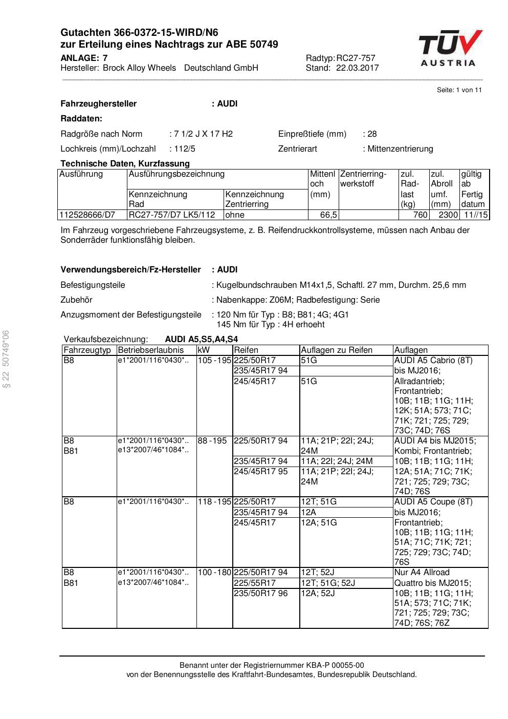Dieses Gutachten (abe) bezieht sich auf die Alufelge Brock RC27-757 in der Ausführung 2Jx17 ET 0, Mittenloch 0 mm (KBA 50749). Im PDF findest du typischerweise zulässige Reifengrößen, Auflagen/Anbauhinweise und – je nach Dokument – Hinweise zur Eintragung.