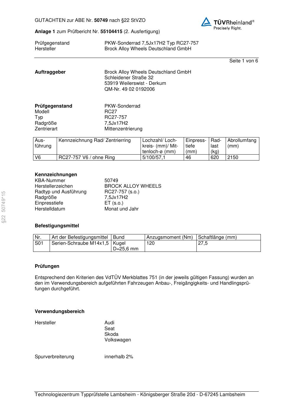 Dieses Gutachten (abe) bezieht sich auf die Alufelge Brock RC27-757 in der Ausführung 7.5Jx17 ET 0, Mittenloch 0 mm (KBA 50749). Im PDF findest du typischerweise zulässige Reifengrößen, Auflagen/Anbauhinweise und – je nach Dokument – Hinweise zur Eintragung.