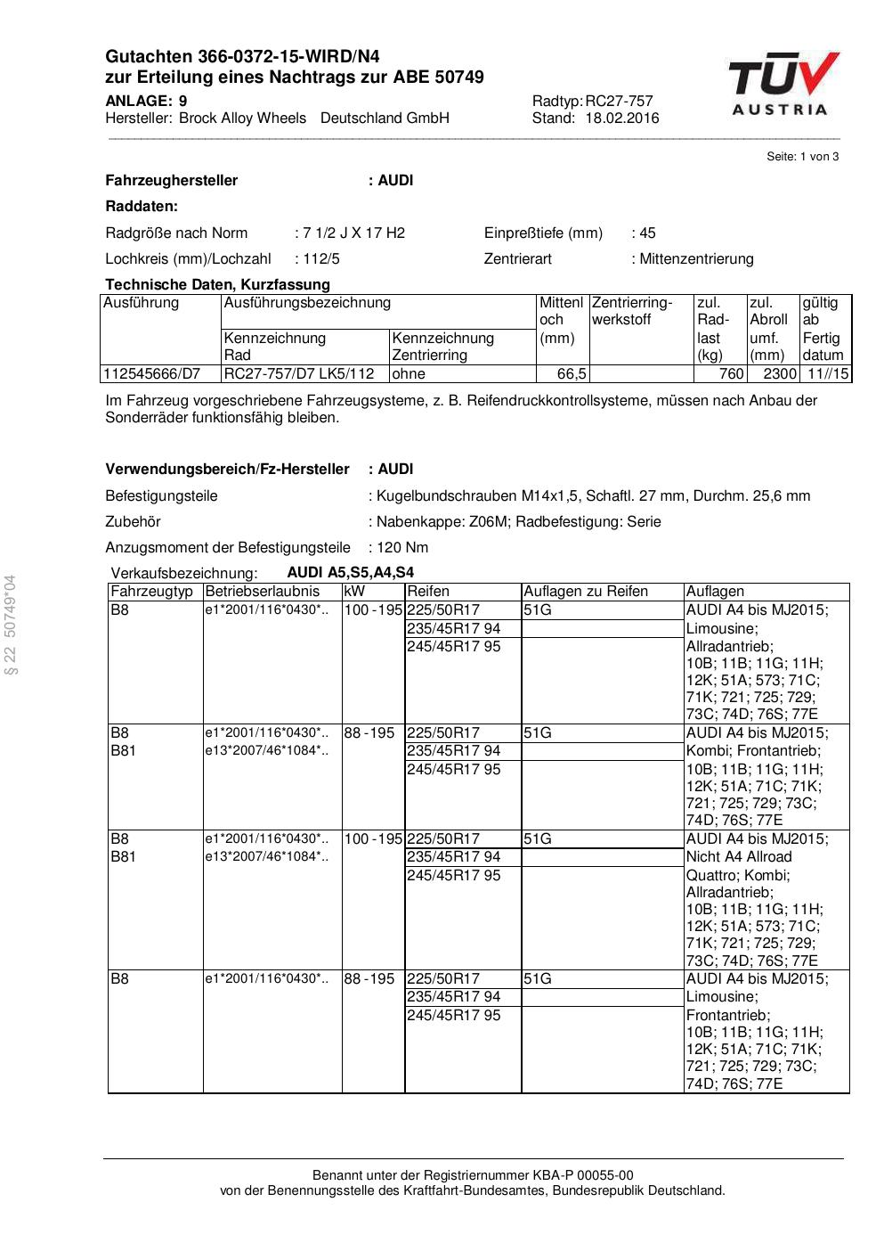Dieses Gutachten (abe) bezieht sich auf die Alufelge Brock RC27-757 in der Ausführung 2Jx17 ET 0, Mittenloch 0 mm (KBA 50749). Im PDF findest du typischerweise zulässige Reifengrößen, Auflagen/Anbauhinweise und – je nach Dokument – Hinweise zur Eintragung.