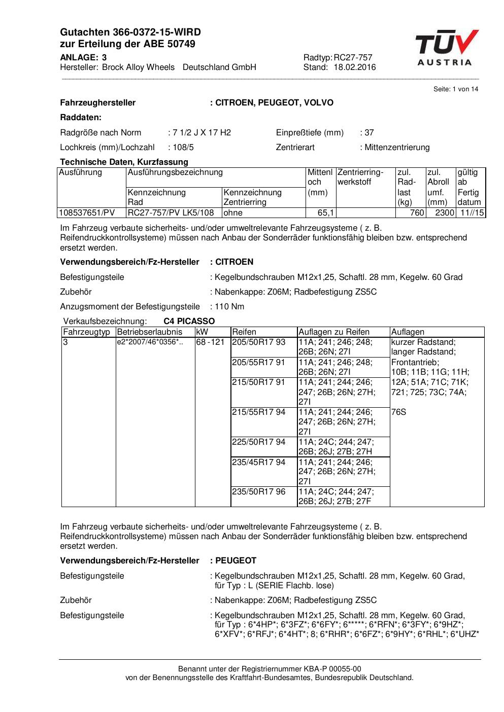 Dieses Gutachten (abe) bezieht sich auf die Alufelge Brock RC27 -757 in der Ausführung 2Jx17 ET 0, Mittenloch 0 mm (KBA 50749). Im PDF findest du typischerweise zulässige Reifengrößen, Auflagen/Anbauhinweise und – je nach Dokument – Hinweise zur Eintragung.