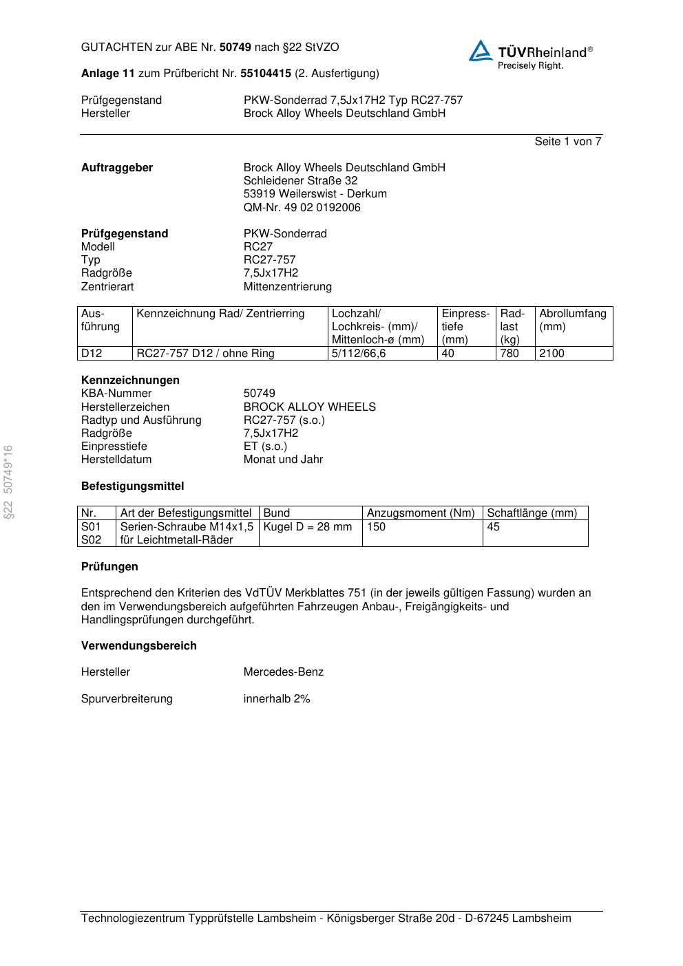 Dieses Gutachten (abe) bezieht sich auf die Alufelge Brock RC27-757 in der Ausführung 7.5Jx17 ET 0, Mittenloch 0 mm (KBA 50749). Im PDF findest du typischerweise zulässige Reifengrößen, Auflagen/Anbauhinweise und – je nach Dokument – Hinweise zur Eintragung.