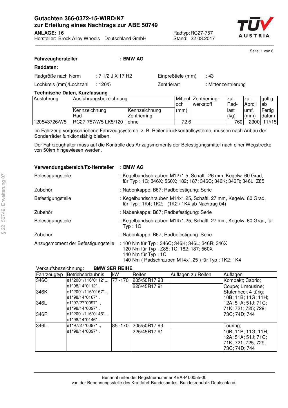 Felgengutachten / abe für Alufelgen Brock RC27-757 (2Jx17 ET 0, Mittenloch 0 mm) mit KBA 50749 (Zertifikatsnummer 50749). Hier kostenlos als PDF herunterladen. Der Download-Link ist 24 Stunden gültig und kann bis zu zwei Mal verwendet werden.