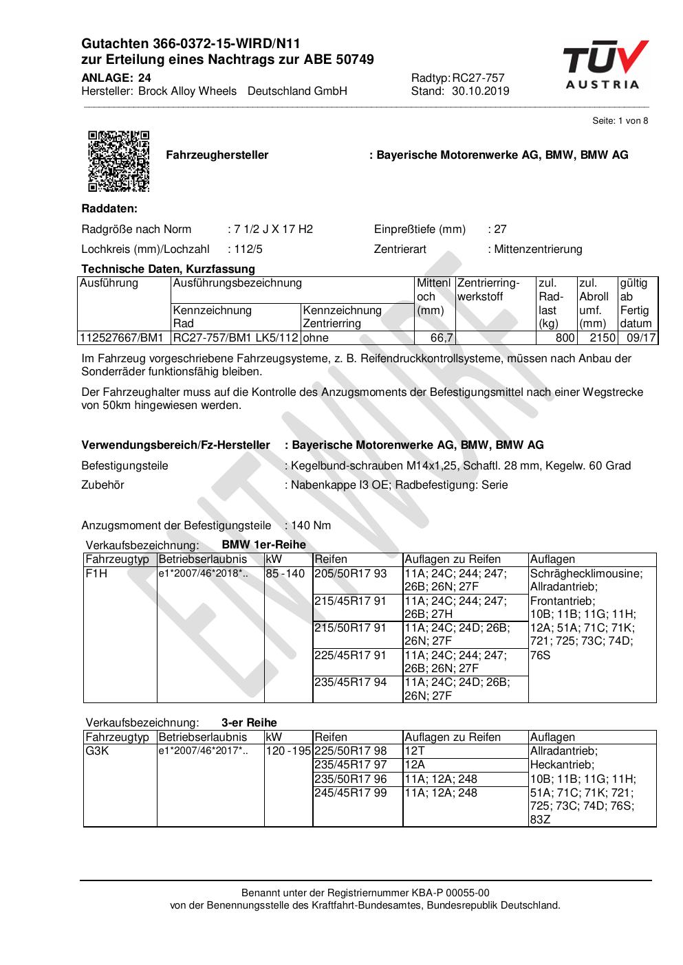 Dieses Gutachten (abe) bezieht sich auf die Alufelge Brock RC27 -757 in der Ausführung 2Jx17 ET 0, Mittenloch 0 mm (KBA 50749). Im PDF findest du typischerweise zulässige Reifengrößen, Auflagen/Anbauhinweise und – je nach Dokument – Hinweise zur Eintragung.